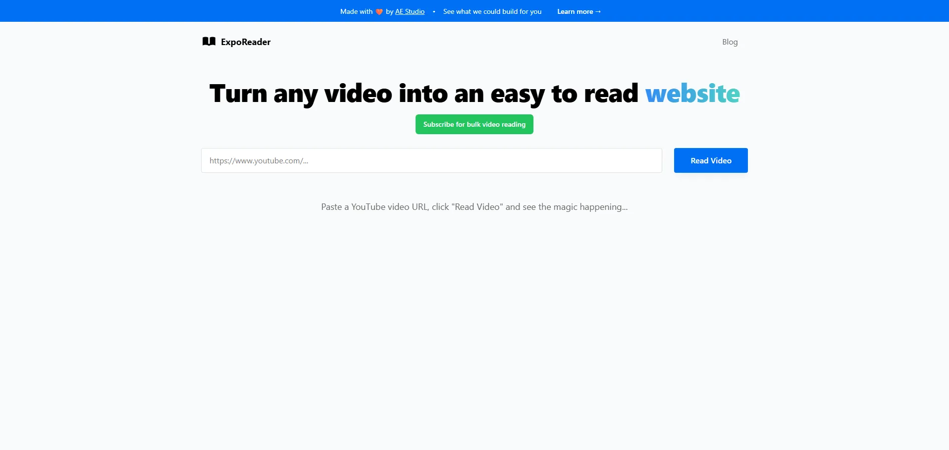 ExpoReader es una herramienta avanzada que convierte automáticamente contenido de vídeo en resúmenes de texto claros y accesibles. Los usuarios solo tienen que pegar la URL de un video de YouTube e iniciar el proceso de lectura para obtener un extracto escrito que facilita el consumo rápido de información. Ideal para optimizar el tiempo y mejorar la comprensión, ExpoReader permite procesar vídeos de forma individual o por lotes, manteniendo a los usuarios al tanto de las últimas funciones y actualizaciones para una experiencia más eficiente.