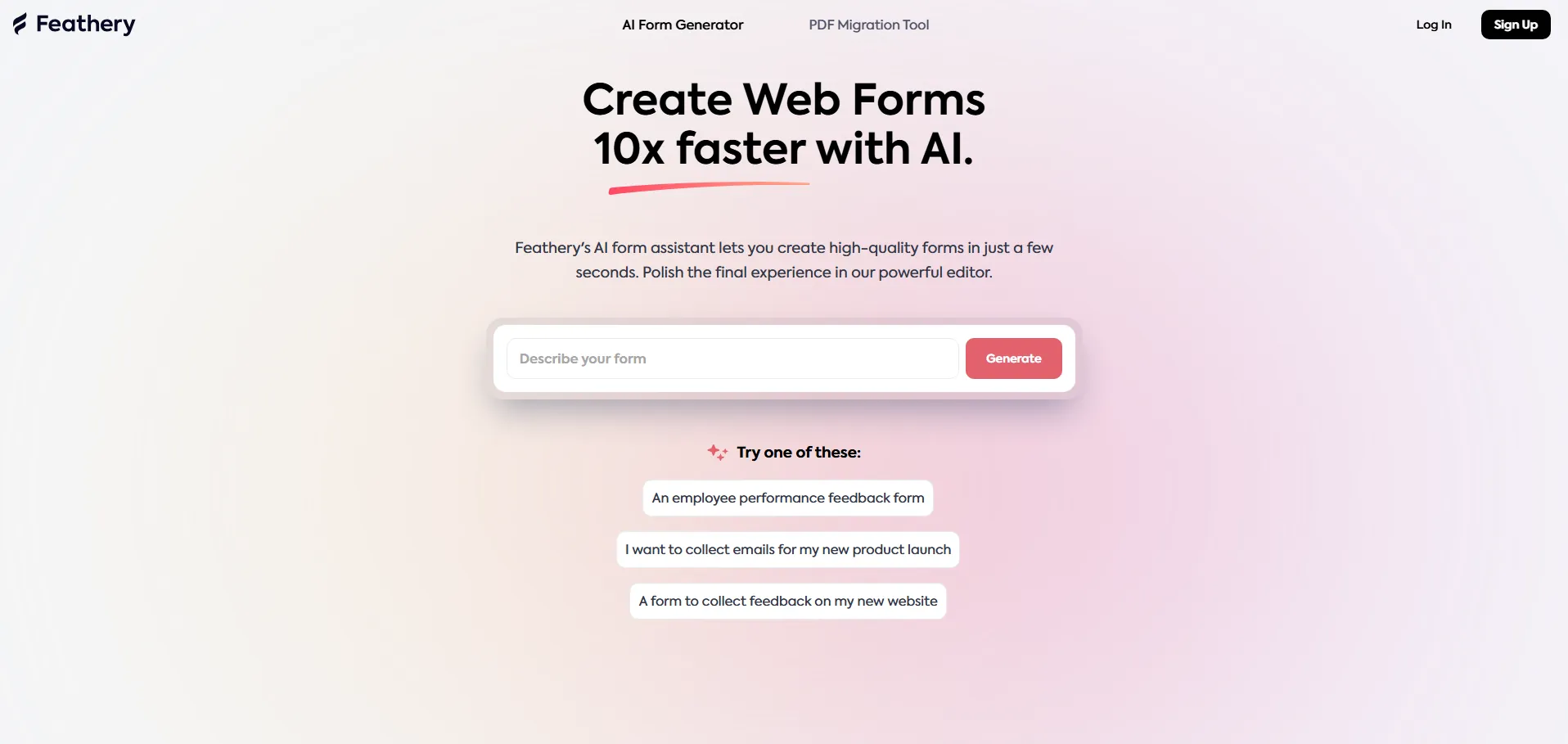 Feathery es un creador avanzado de formularios con inteligencia artificial que agiliza la generación de formularios web profesionales en cuestión de segundos. Permite migrar fácilmente formularios existentes desde Typeform, aprovechar un asistente impulsado por IA para diseñar flujos de preguntas optimizados y ajustar cada detalle mediante un editor visual potente. Compatible con múltiples idiomas y adaptable a diversos objetivos, Feathery simplifica la recolección de datos, ahorrando tiempo y esfuerzo a equipos de marketing, recursos humanos y desarrollo web.