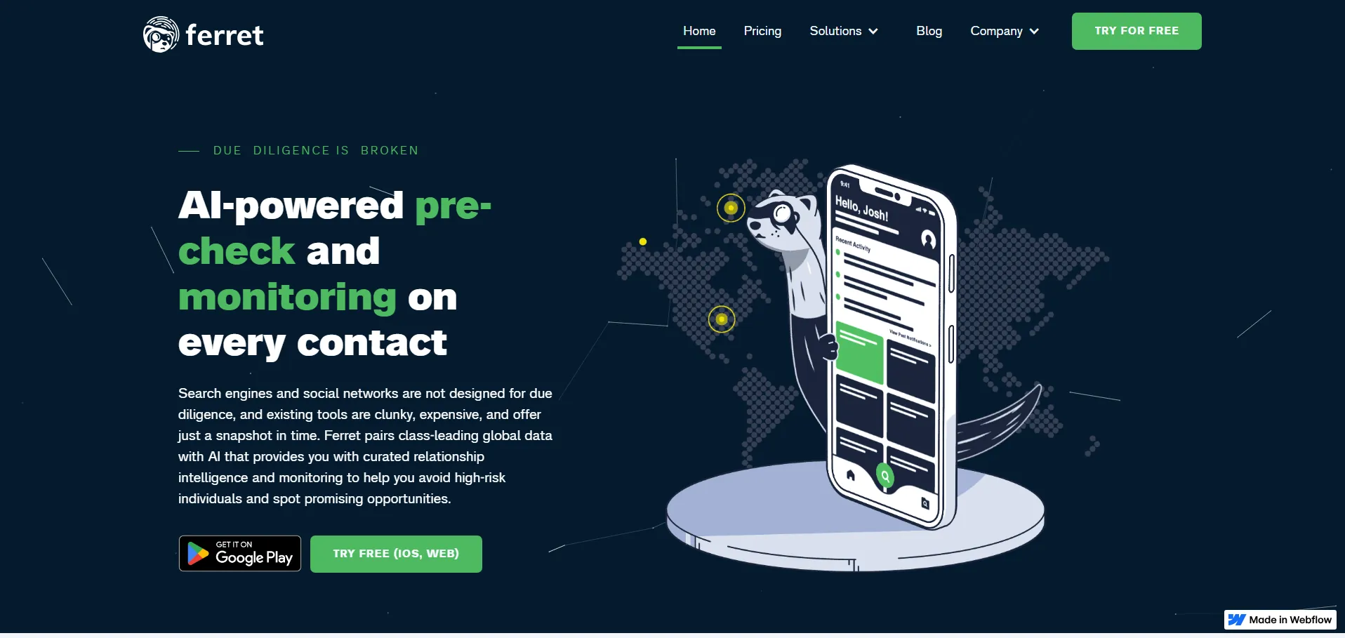 Ferret es una plataforma de inteligencia relacional impulsada por IA que recopila y analiza datos de motores de búsqueda y redes sociales para ofrecer información exclusiva de primer nivel. Su tecnología avanzada permite realizar procesos de debida diligencia, prevenir riesgos y detectar oportunidades de negocio con rapidez y precisión.
