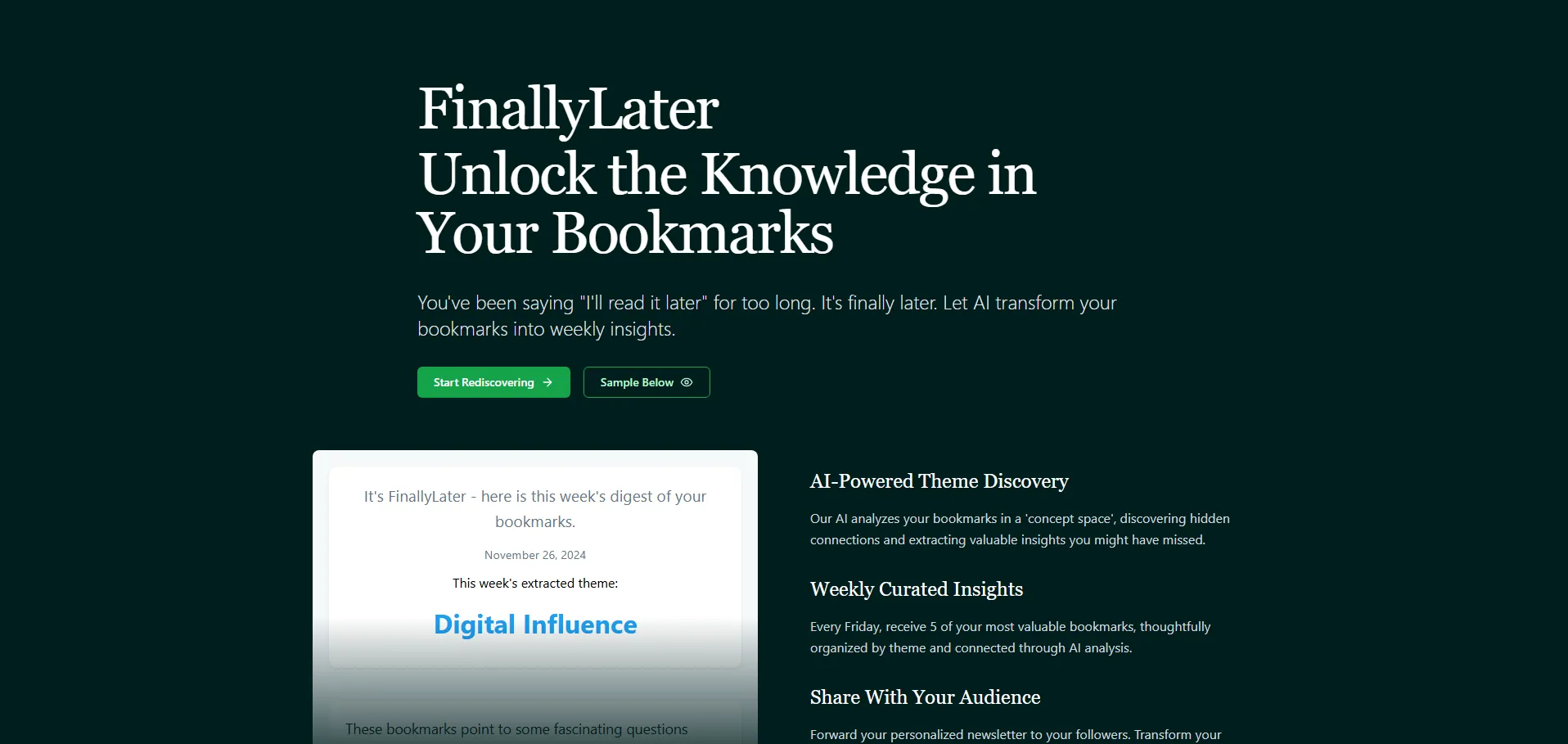 Finally Later es una plataforma de gestión de marcadores potenciada por inteligencia artificial. Analiza y categoriza tus enlaces guardados para revelar temas ocultos y relaciones relevantes. Cada semana, envía un boletín con cinco marcadores destacados, facilitando la revisión de contenido clave y el intercambio de colecciones temáticas. Con funciones de curación automatizada y recomendaciones inteligentes, Finally Later optimiza el redescubrimiento de información y potencia tu productividad digital.
