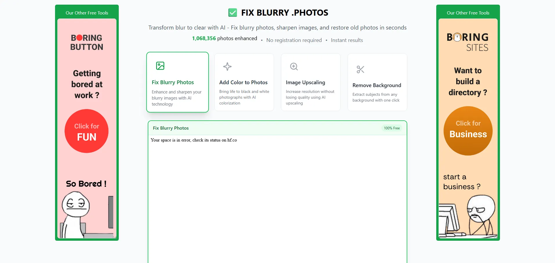 Reparar Fotos Borrosas es una herramienta gratuita impulsada por IA diseñada para devolver la nitidez a imágenes desenfocadas. Mediante algoritmos de restauración automática e integración optimizada con Vercel y ReplicateHQ, corrige artefactos y recupera detalles con rapidez, permitiéndote rescatar recuerdos y documentos visuales con resultados sorprendentes.