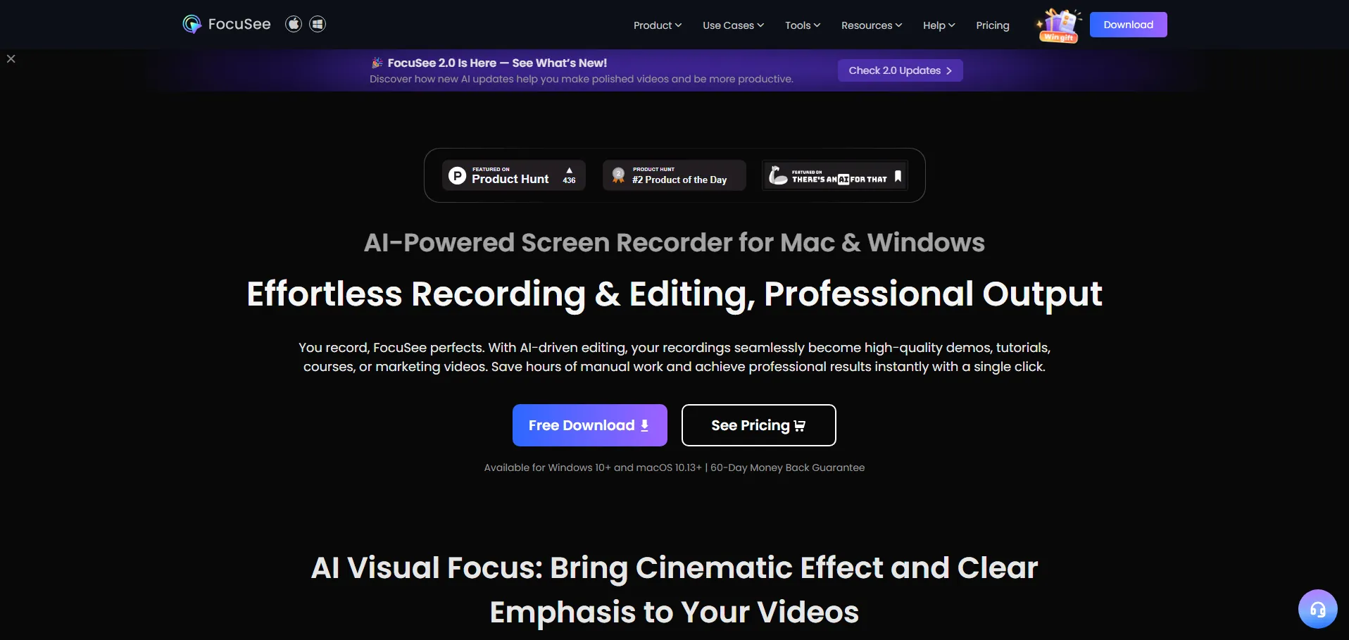 FocuSee es una herramienta de postproducción de video automatizada que convierte grabaciones de pantalla en videos promocionales profesionales sin complicaciones. Gracias a su sistema de edición de video con IA, combina captura de pantalla, selfie y voz en off para aplicar efectos de zoom dinámicos, mejoras de fondo, filtros y subtítulos automáticos. Además, integra cuestionarios, formularios y botones de llamada a la acción, y ofrece formatos de exportación optimizados para redes sociales. Disponible para Windows 10+ y macOS 10.13+.