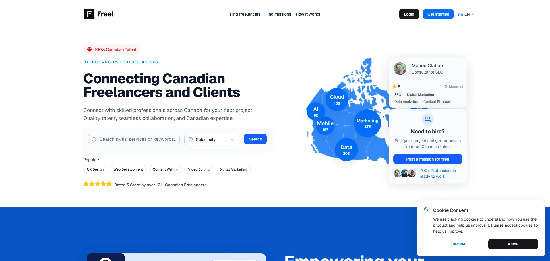Freel es una red canadiense de consultores freelance que conecta profesionales independientes con clientes locales. Gracias a un perfil personalizable, Freel potencia la visibilidad ante reclutadores y empresas, resaltando habilidades y experiencia. Su panel de control intuitivo ofrece métricas y KPIs detallados para gestionar proyectos de forma eficiente, mientras que las ofertas de empleo locales y la comunicación directa crean una experiencia de mercado dinámica en Canadá.