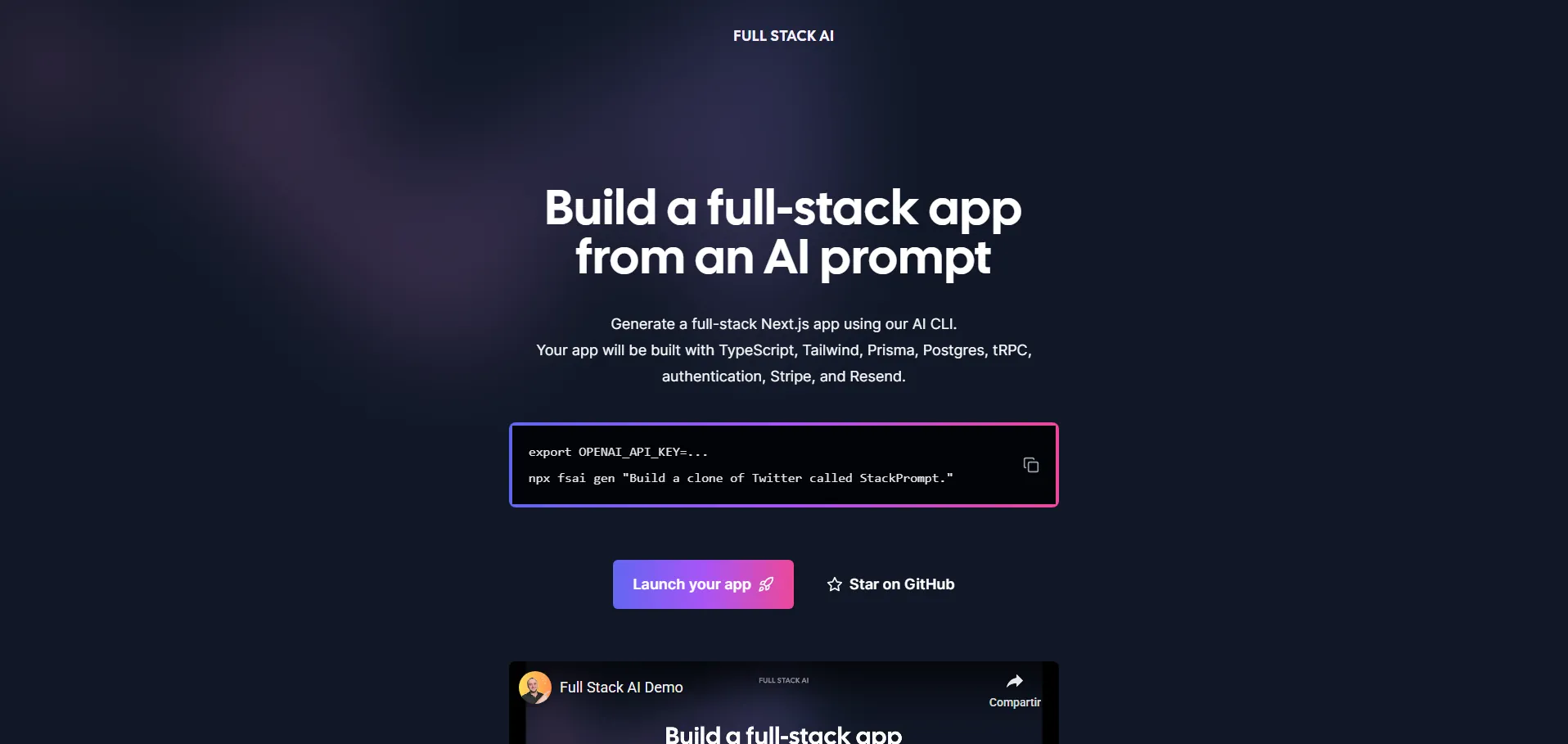 Full Stack AI es una herramienta de inteligencia artificial que acelera la creación de aplicaciones full-stack. Mediante un CLI impulsado por IA, genera proyectos Next.js en TypeScript con integraciones listas de Tailwind CSS, Prisma, PostgreSQL, tRPC, autenticación y Stripe. Además, facilita la automatización de correos electrónicos para mantener la bandeja de entrada vacía y optimizar el flujo de trabajo de desarrolladores.