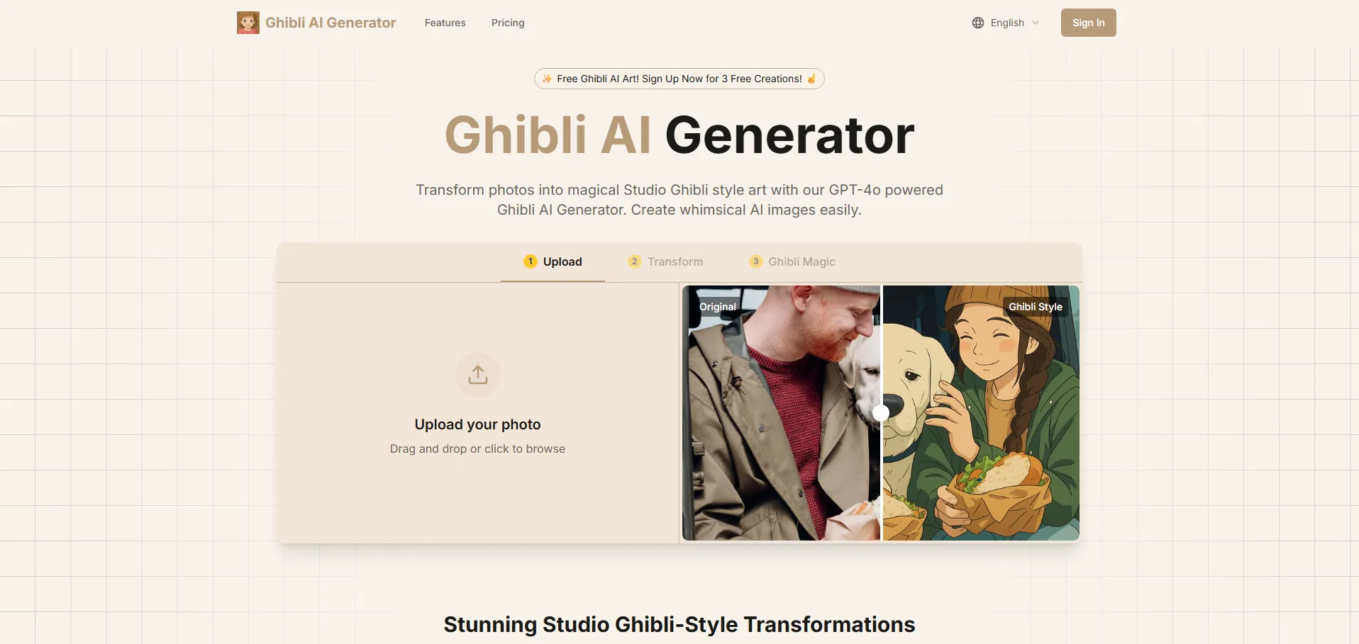 Ghibli AI Generator es una herramienta online basada en inteligencia artificial que transforma tus fotografías en ilustraciones con el encanto y la atmósfera nostálgica de Studio Ghibli. Gracias a su motor de IA avanzado, captura la paleta de colores, la iluminación suave y los detalles caprichosos característicos de las películas de Ghibli, permitiéndote crear arte digital, fondos de pantalla y diseños únicos sin necesidad de habilidades de dibujo.