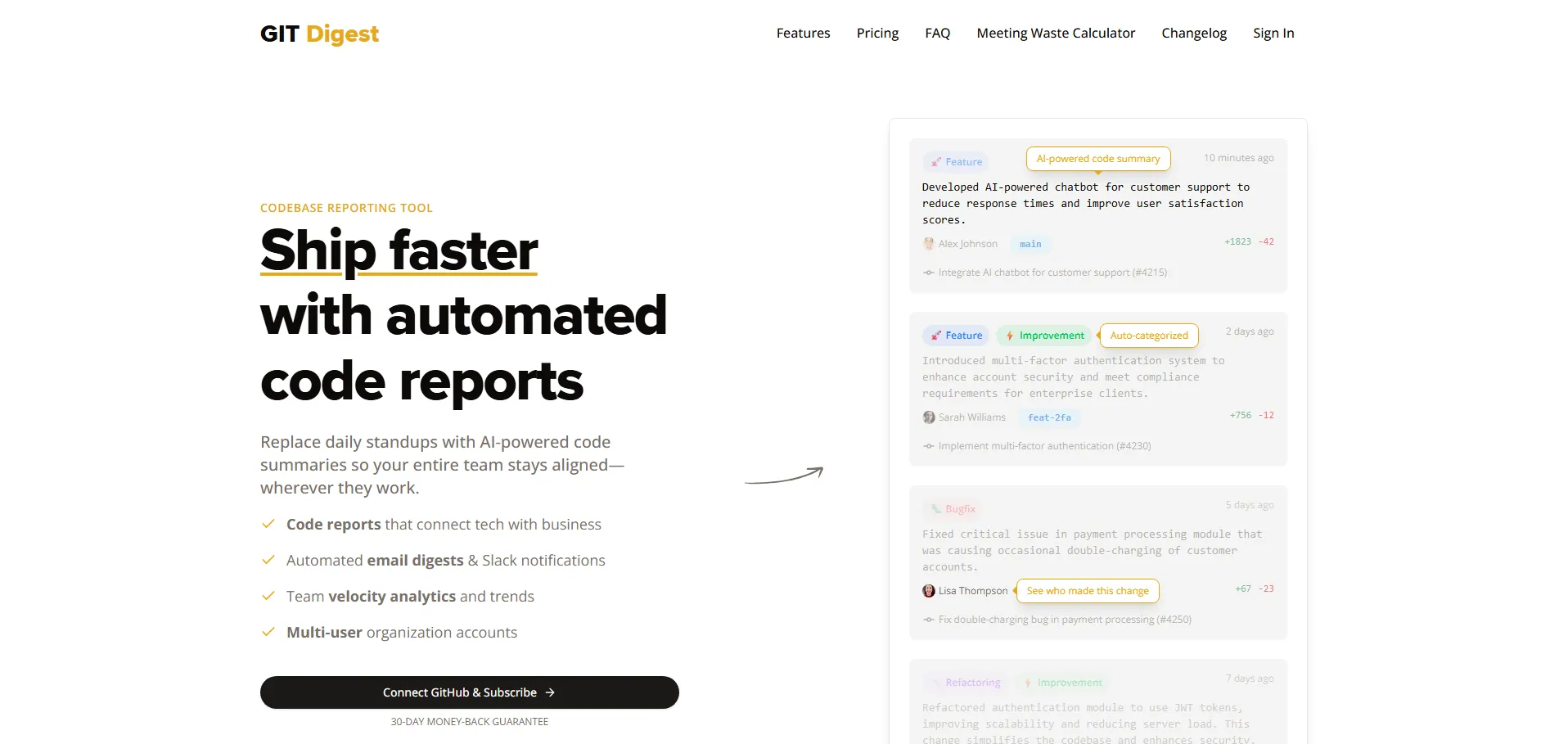 Git Digest es una herramienta potenciada por inteligencia artificial que genera resúmenes automáticos de cambios en el código, facilitando la alineación y productividad de equipos de desarrollo. Envía reportes diarios o semanales directamente al correo de los miembros, ofrece gráficos interactivos para visualizar tendencias y monitorizar la velocidad del equipo, y permite gestionar múltiples cuentas organizacionales. Además, incorpora un chatbot de IA para atención al cliente, mejorando la resolución de incidencias y la satisfacción de los usuarios.
