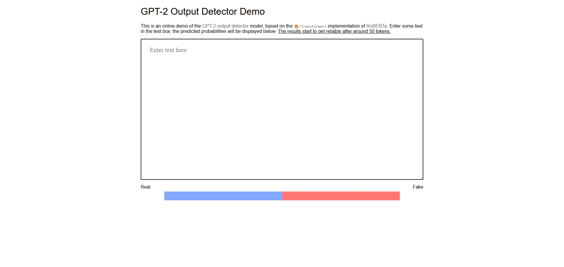 El Detector de Salida GPT-2 es una solución online basada en el modelo RoBERTa entrenado para identificar la probabilidad de que un fragmento de texto haya sido generado por IA o proceda de una fuente humana. Al introducir hasta 50 tokens en su interfaz, analiza estadísticamente las características lingüísticas para ofrecer una puntuación de autenticidad fiable. Este detector de texto falso y verificador de autenticidad es ideal para validar la veracidad de artículos, posts o documentos, optimizando flujos de trabajo de verificación y control de calidad de contenido.