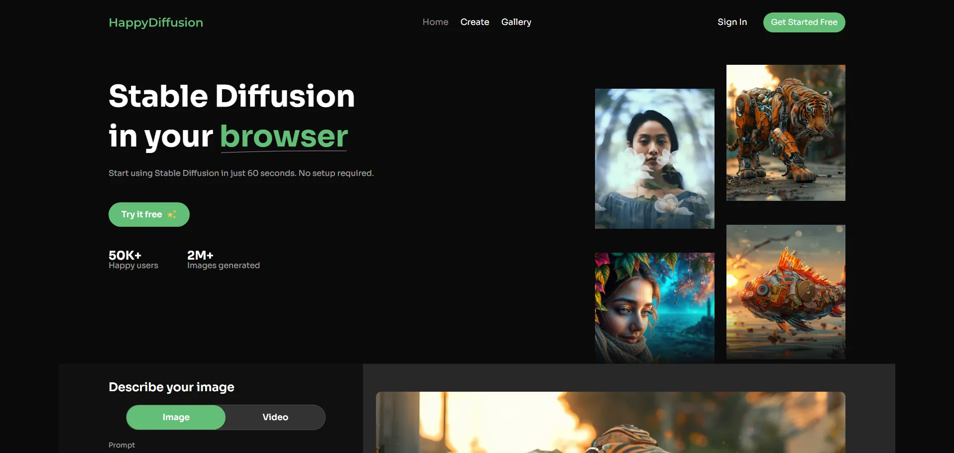 HappyDiffusion es un generador de arte online con IA basado en modelos de difusión estables, que permite producir imágenes de alta resolución en cuestión de minutos sin necesidad de instalaciones o configuraciones complejas. Su plataforma de creación de arte con IA ofrece acceso inmediato a más de 50 modelos prediseñados y la posibilidad de cargar un número ilimitado de plantillas personalizadas. Con una interfaz web intuitiva y una comunidad activa, HappyDiffusion facilita la generación de imágenes de alta calidad para proyectos creativos, marketing y entretenimiento.