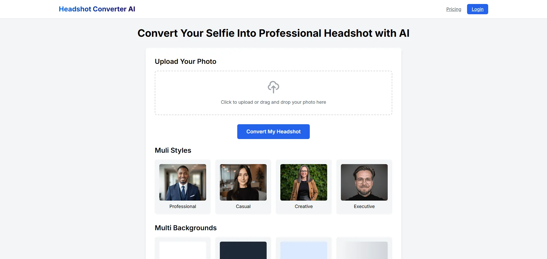 Headshot Converter AI es una plataforma web basada en inteligencia artificial que transforma selfies en retratos profesionales de alta calidad en cuestión de segundos. Los usuarios simplemente suben su foto, eligen entre estilos como profesional, casual, creativo o ejecutivo, y seleccionan fondos (blanco, gris oscuro, azul claro o degradado). Gracias a su vista previa en tiempo real y a su procesamiento seguro de imágenes, garantiza resultados impecables y privacidad, sin necesidad de contratar a un fotógrafo.