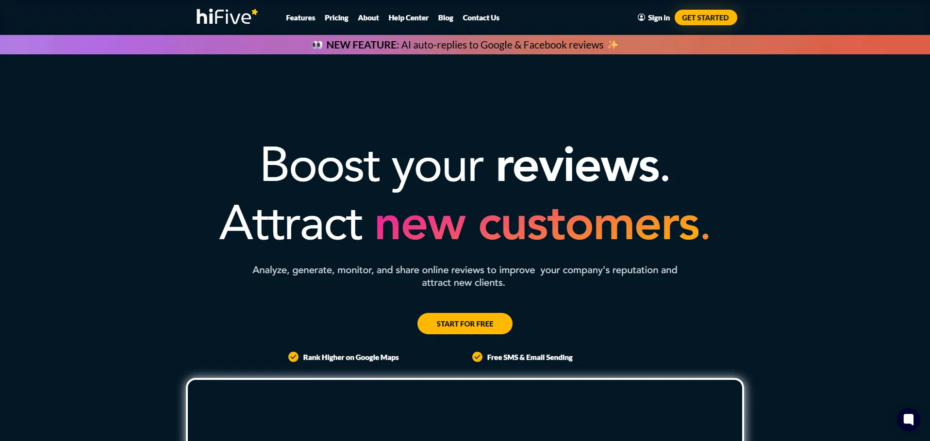 HiFive es una plataforma integral de gestión de reseñas que permite a las empresas maximizar su reputación online y atraer nuevos clientes a través de feedback verificado. Con HiFive puedes generar invitaciones a opinar vía email, SMS o códigos QR, monitorizar reseñas en Google, Facebook y otros portales desde un único panel, y filtrar comentarios negativos para mantenerlos privados. Además, facilita responder rápidamente a todas las opiniones y ofrece análisis de reputación para optimizar tu estrategia de marketing digital.