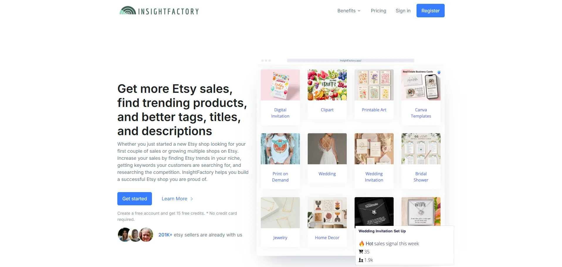 InsightFactory es una plataforma de inteligencia de mercado para vendedores de Etsy que proporciona datos diarios sobre tendencias de búsqueda, análisis de la competencia y desempeño de ventas. Con un panel intuitivo y generación automática de títulos y descripciones optimizadas para SEO, ayuda a descubrir nichos de baja competencia y acelerar el crecimiento de tu tienda.