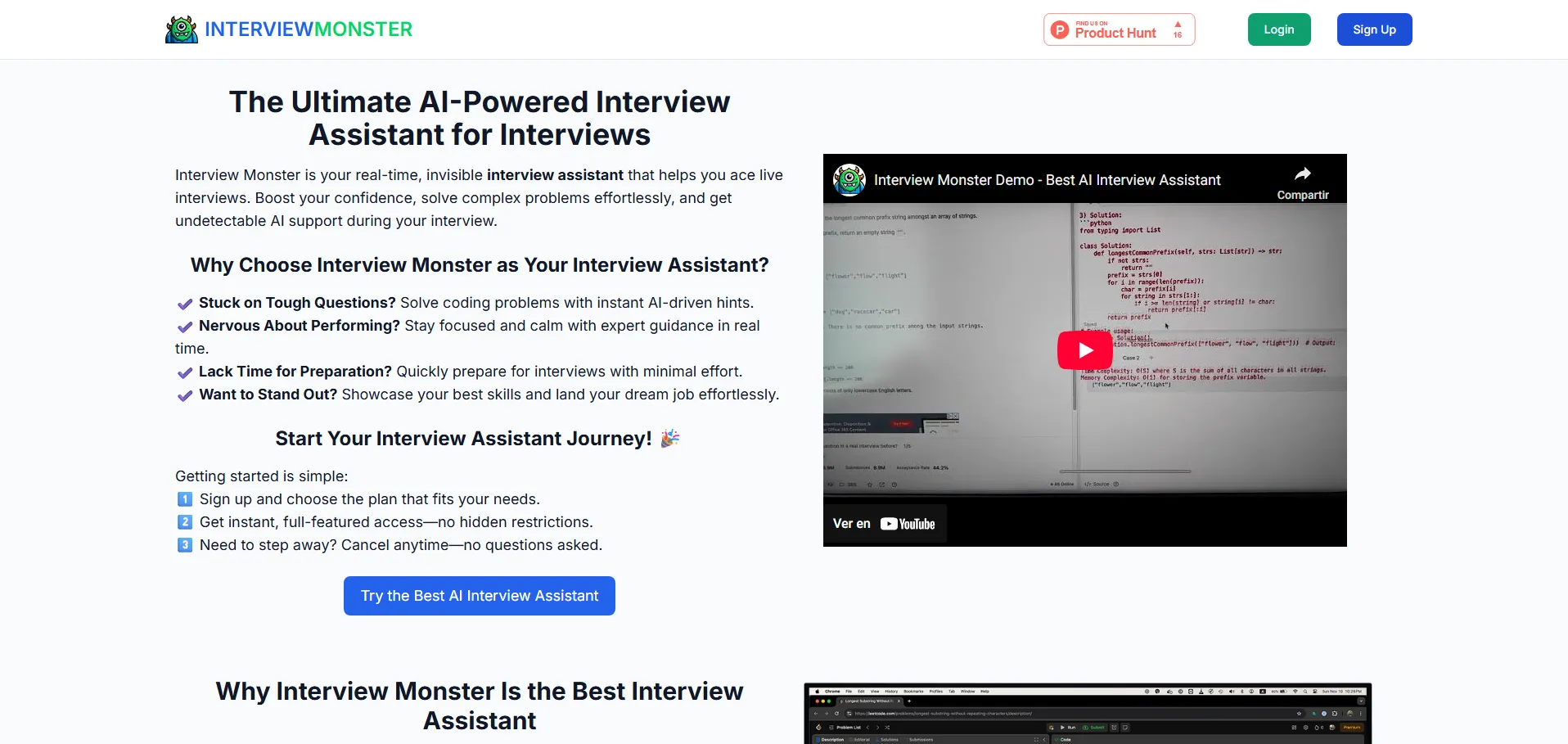 InterviewMonster es un asistente de entrevistas con IA diseñado para proporcionar apoyo y sugerencias en tiempo real durante entrevistas técnicas en vivo. Su motor de inteligencia artificial avanzada ayuda a resolver preguntas complejas de programación y a reforzar la confianza del candidato. Con compatibilidad en lenguajes como Python, Java y SQL, ofrece indicaciones personalizables para optimizar tu rendimiento y maximizar tus oportunidades laborales.