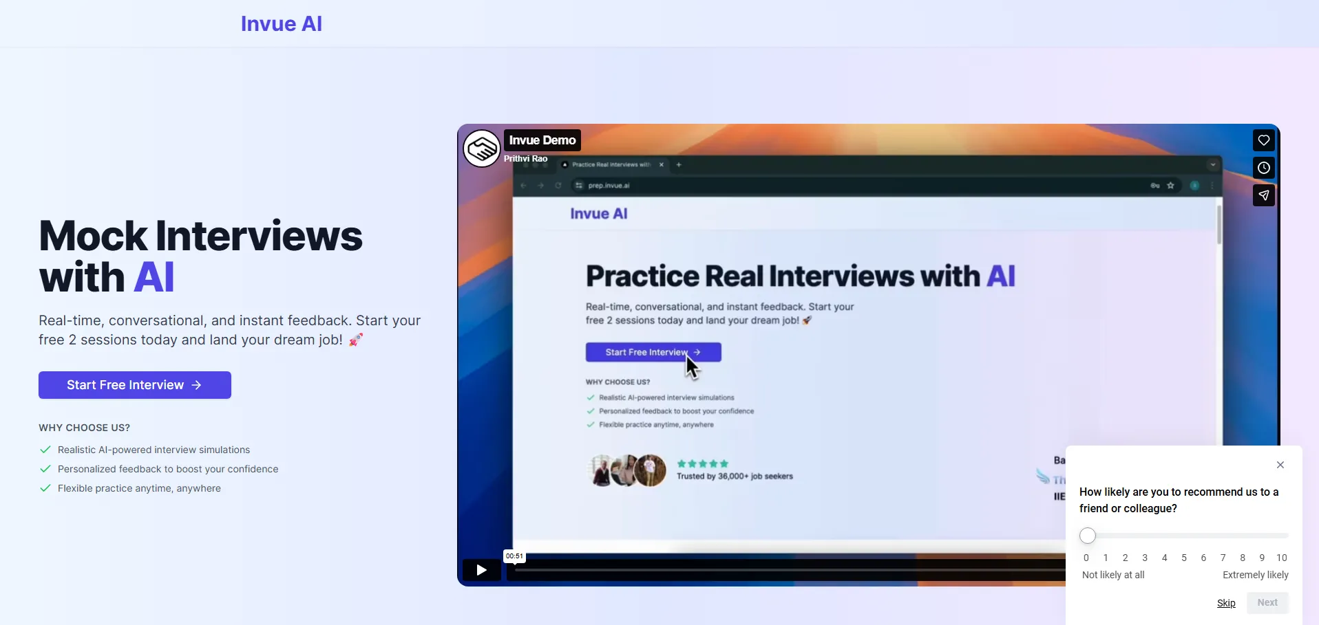 InVue AI es una plataforma de preparación de entrevistas impulsada por inteligencia artificial que ofrece simulacros realistas y retroalimentación personalizada. Permite a los usuarios seleccionar el puesto deseado e introducir su currículum para generar sesiones de práctica conversacionales en tiempo real. Tras cada simulacro, InVue AI proporciona una evaluación completa con un informe detallado que destaca fortalezas y áreas de mejora, ayudando a los candidatos a monitorear su progreso y aumentar su confianza.