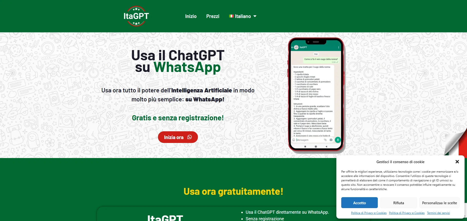 ItaGPT es una solución de inteligencia artificial integrada en WhatsApp que actúa como asistente virtual, permitiendo a los usuarios interactuar con ChatGPT sin instalar apps adicionales. Ofrece respuestas inmediatas en lenguaje natural, controla el consentimiento de cookies y brinda una experiencia de navegación optimizada. No requiere registro ni tarjeta de crédito, y facilita desde sugerencias de recetas y resolución de problemas matemáticos hasta consejos de salud directamente en tu mensajero.