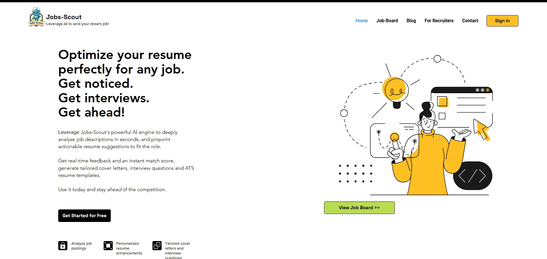 Jobs Scout es una herramienta de búsqueda de empleo basada en inteligencia artificial que analiza ofertas de empleo y currículums. Ofrece información detallada e identifica elementos faltantes para ayudar a los usuarios a conseguir el trabajo de sus sueños en tiempo récord. Además, permite dar seguimiento organizado a los intereses laborales y generar ejemplos de cartas de presentación personalizados según la experiencia real.