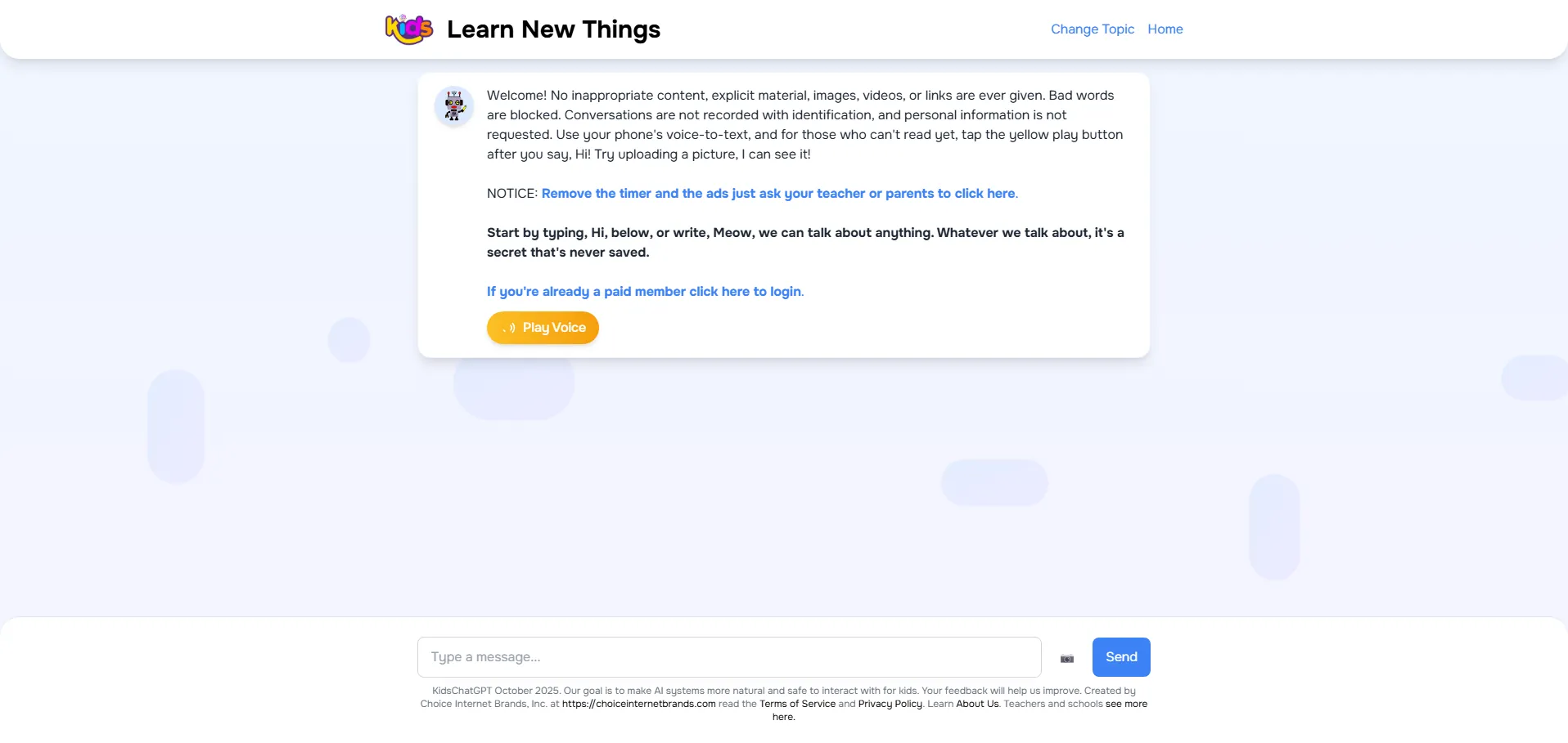 Kids ChatGPT es un chat seguro para niños basado en inteligencia artificial, diseñado para fomentar el aprendizaje interactivo y la alfabetización digital en un entorno online protegido. Con filtros avanzados contra contenido inapropiado y una estricta política de privacidad, ofrece voz a texto y acceso mediante un botón amarillo que inicia conversaciones sobre ciencia, historia, arte y más. El sistema registra sesiones para facilitar la supervisión, garantizando una experiencia divertida, educativa y libre de riesgos.