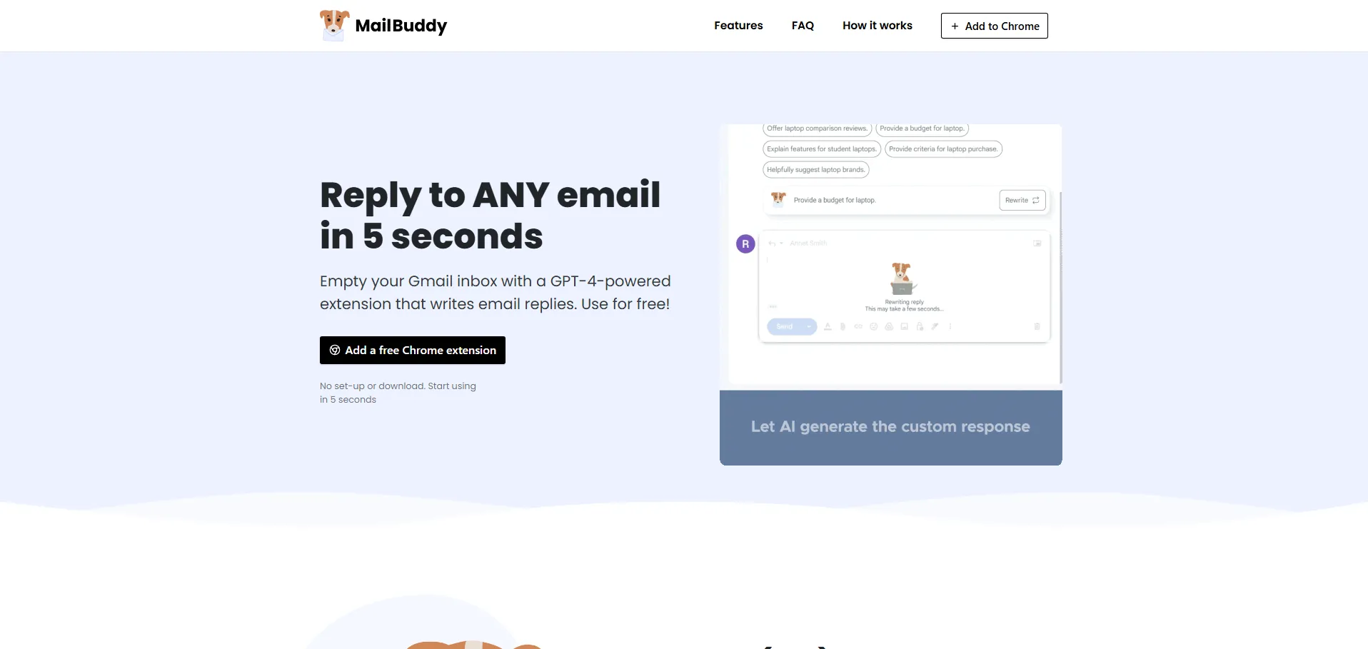 MailBuddy es un asistente de correo electrónico potenciado por inteligencia artificial y tecnología GPT-3.5 que se integra directamente en Gmail como extensión de Chrome gratuita. Al hacer clic en responder, analiza el mensaje entrante y genera opciones de respuesta personalizadas en menos de 5 segundos, permitiéndote ahorrar tiempo y mejorar la eficiencia en tus comunicaciones. Ofrece ajustes de tono y estilo para que cada correo suene auténtico y acorde a las necesidades de tu negocio, sin requerir configuraciones adicionales ni curva de aprendizaje.