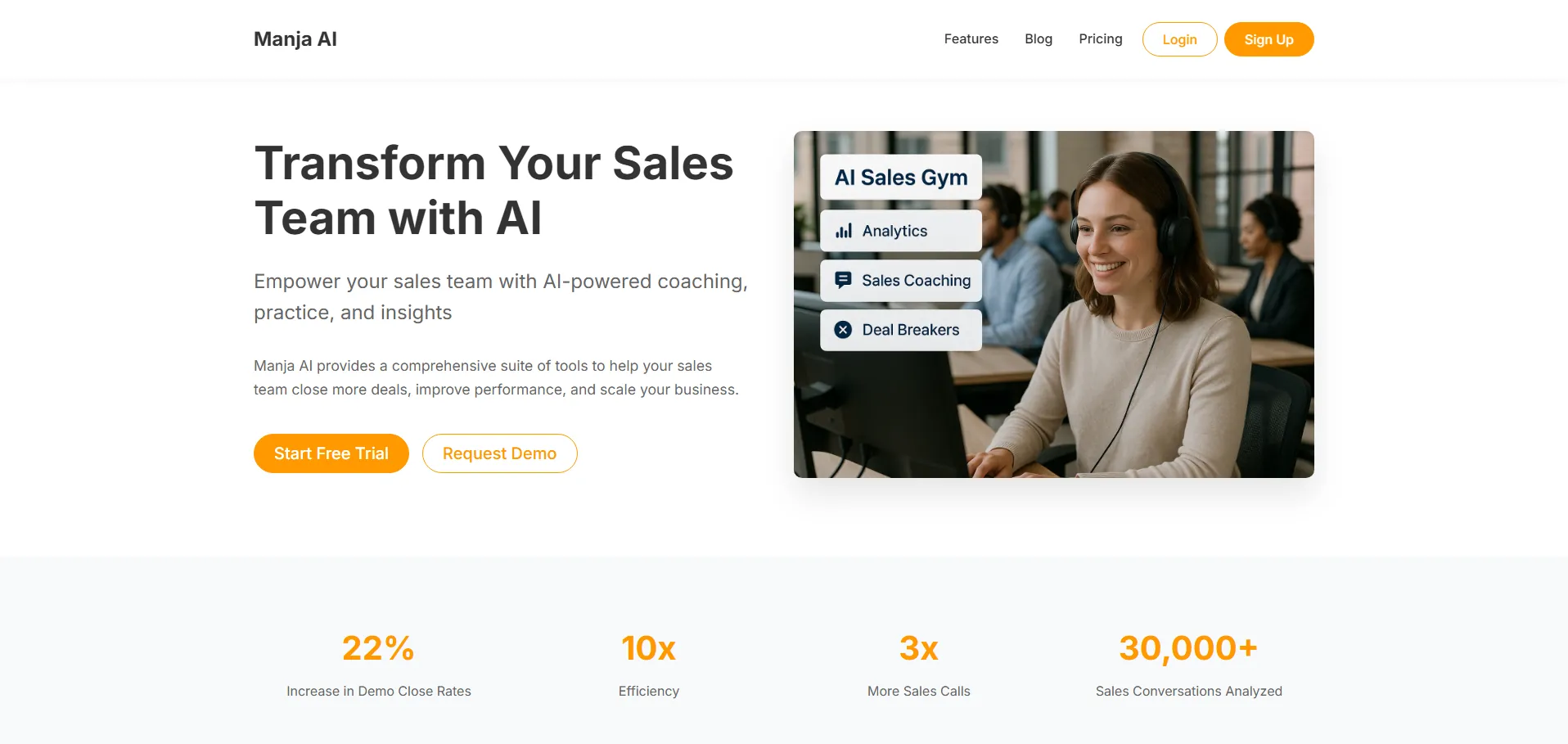 Manja es un coach de ventas potenciado por inteligencia artificial que ofrece orientación y análisis en tiempo real. Con un asistente virtual que evalúa cada interacción, esta plataforma detecta oportunidades de mejora, fortalece las habilidades de los agentes y proporciona datos accionables para optimizar las estrategias de ventas y fomentar relaciones duraderas con los clientes.