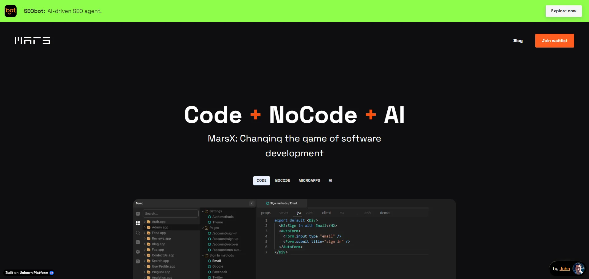 MarsX es una plataforma low-code impulsada por inteligencia artificial que permite diseñar, desarrollar y desplegar aplicaciones de forma rápida y eficiente. Con una interfaz intuitiva de arrastrar y soltar, automatización de código y plantillas preconfiguradas, MarsX reduce drásticamente el tiempo y la complejidad del desarrollo, ofreciendo soluciones robustas, seguras y escalables para todo tipo de proyectos.