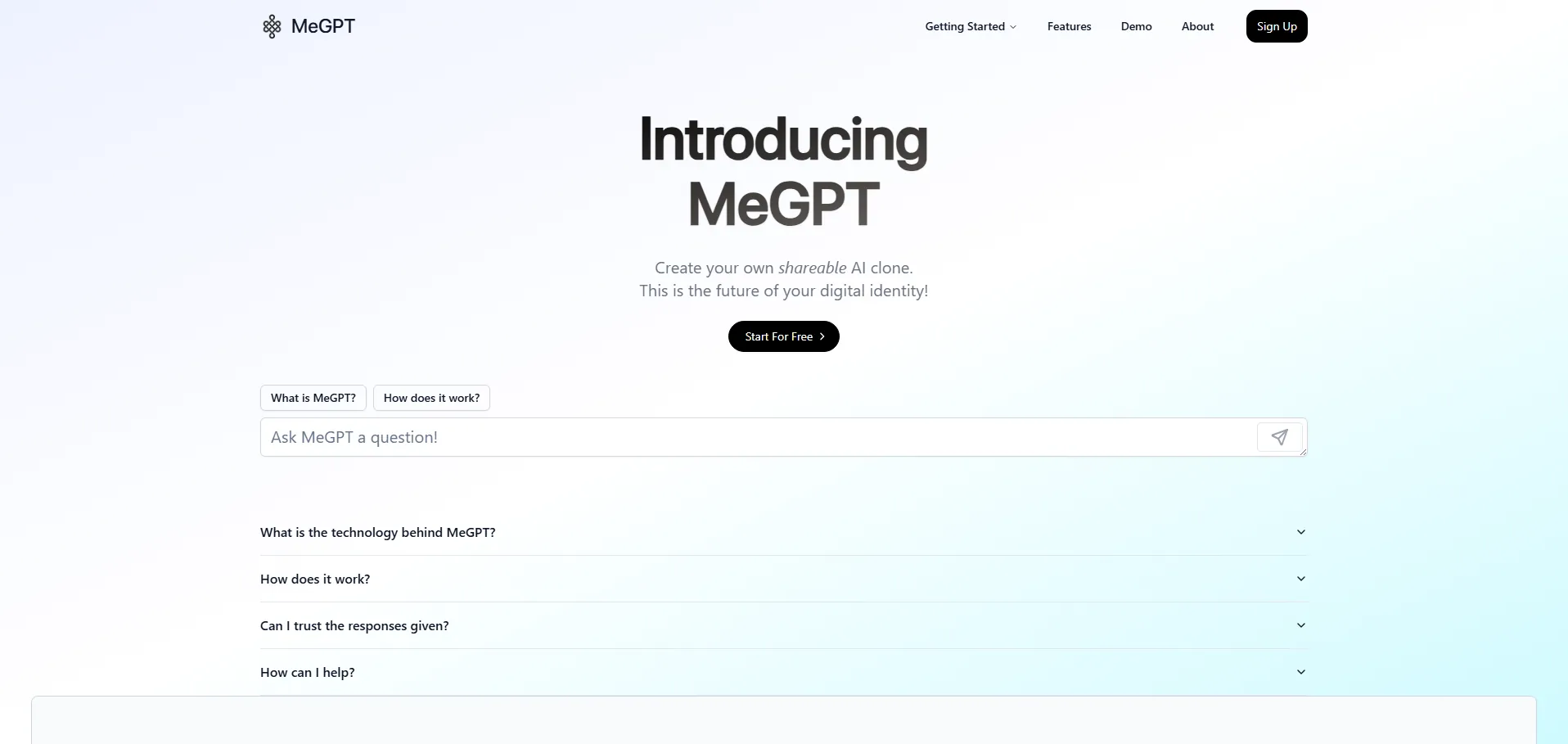 MeGPT es una herramienta innovadora que permite crear un clon de inteligencia artificial compartible en minutos. Con tecnología avanzada que replica gestos, lenguaje e intereses, las conversaciones resultan naturales y atractivas. Gracias a su función de enlace corto a MeGPT.xyz, compartir tu clon es sencillo y las interacciones en línea se vuelven más dinámicas. Además, MeGPT ofrece análisis detallados de los clones, incluyendo datos de ubicación, para optimizar la experiencia de usuario y obtener información práctica.