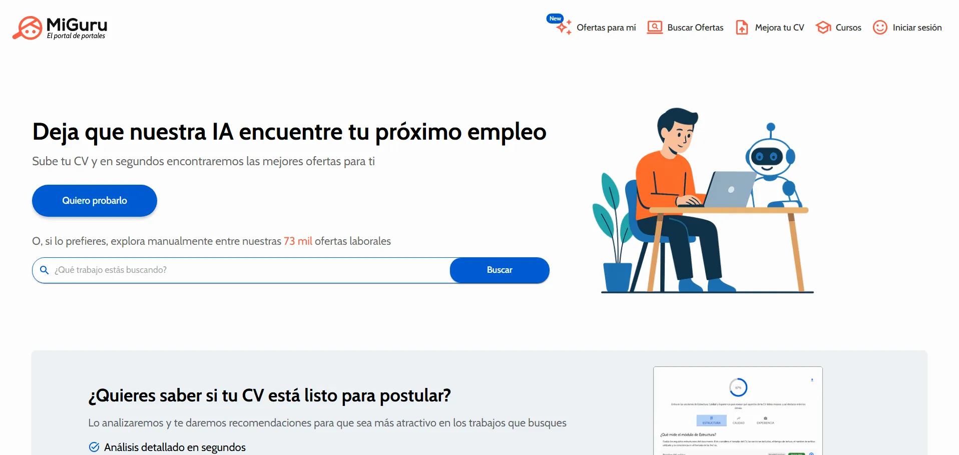 MiGuru AI es una plataforma de búsqueda de empleo impulsada por inteligencia artificial que centraliza más de 400 portales en una única interfaz. Con su tecnología avanzada, completa automáticamente tus postulaciones usando los datos de tu CV y genera un informe personalizado con recomendaciones para optimizar tu currículum según las mejores prácticas del mercado. Además, ofrece filtros por industria, ubicación, salario y otros criterios, agilizando tu proceso y aumentando tus oportunidades laborales.