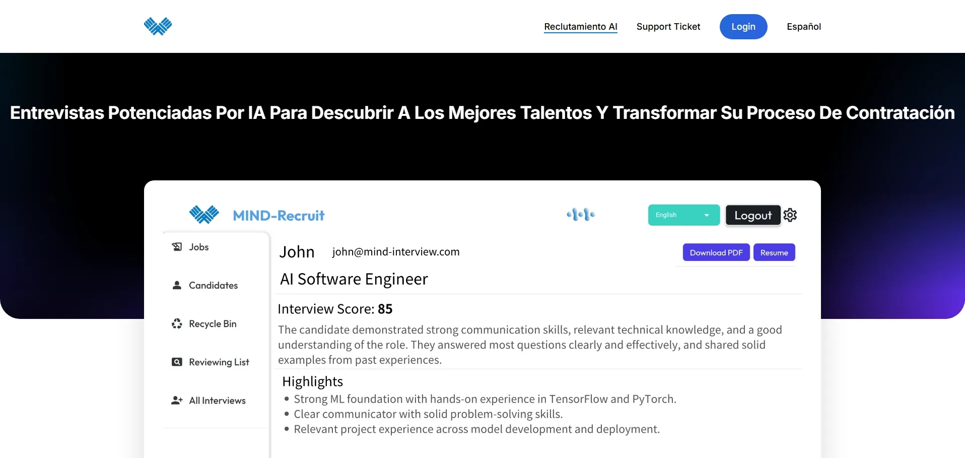 Disponible como plataforma web y aplicaciones móviles para iOS y Android. Accede a guías de práctica, videotutoriales y soporte especializado en el centro de ayuda del sitio oficial de MIND-Interview.