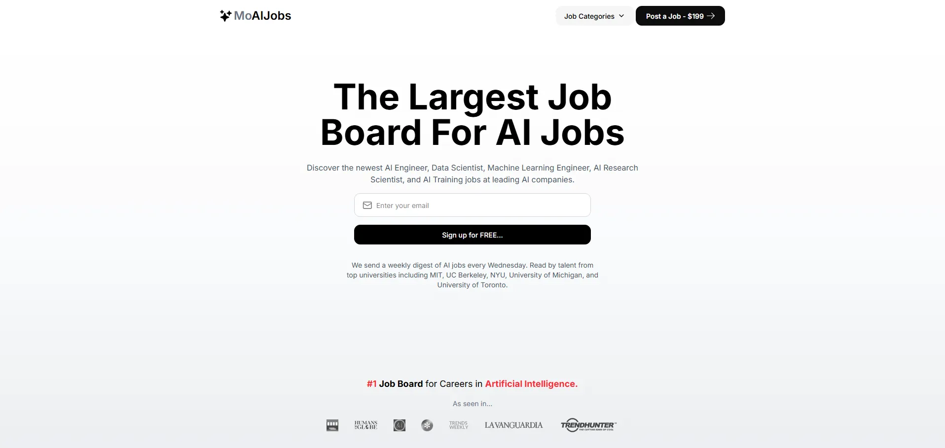 MoAIJobs es una plataforma de empleo impulsada por inteligencia artificial, especializada en conectar profesionales con oportunidades laborales en aprendizaje automático, ingeniería de IA, ciencia de datos e investigación. Gracias a su tecnología de recomendación basada en IA, los usuarios pueden publicar ofertas y explorar vacantes en empresas líderes del sector con un alcance global y una interfaz intuitiva que simplifica toda la experiencia de búsqueda y selección.