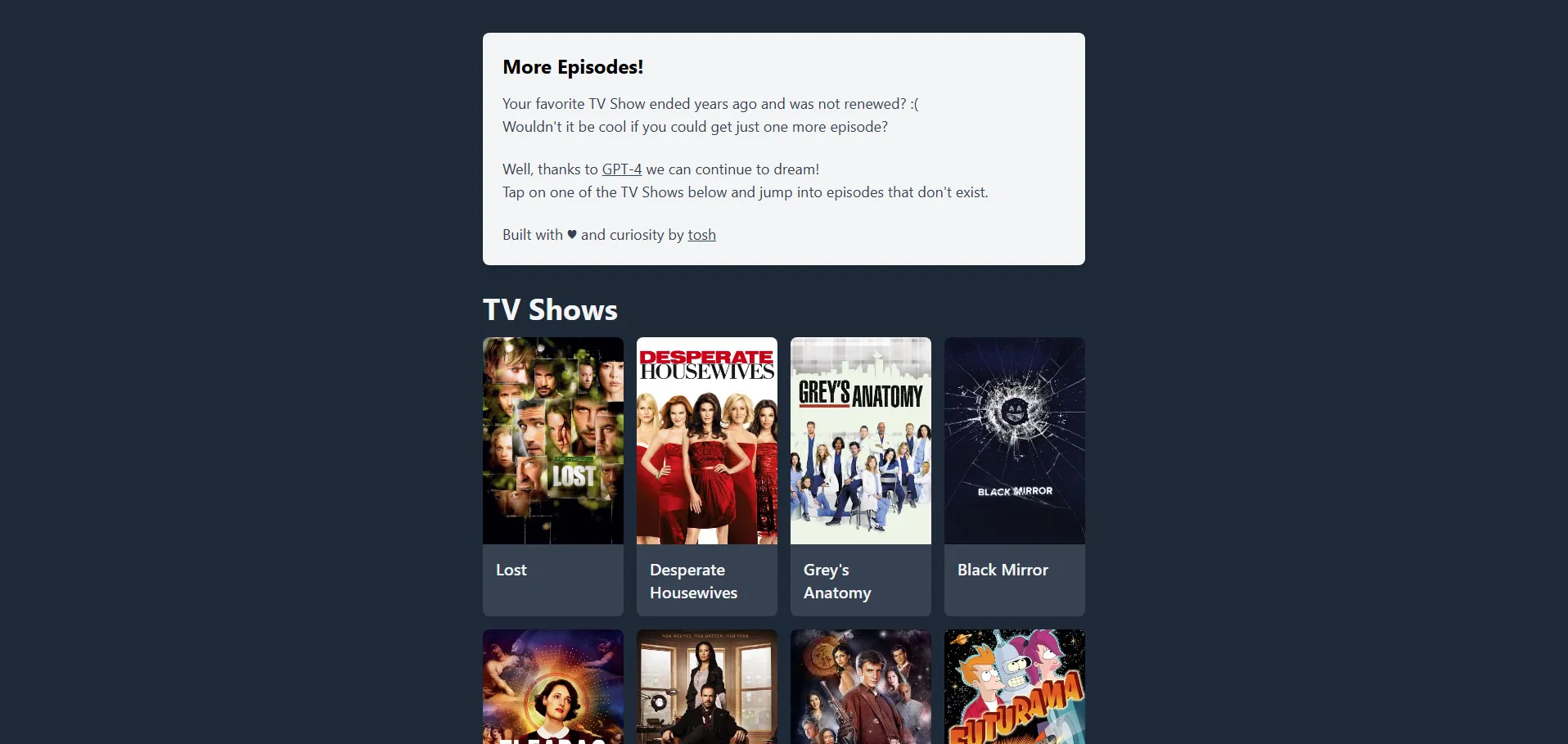 Más Episodios es un generador de episodios de Programas de TV potenciado por GPT-4. Permite crear capítulos inéditos de series populares, desde clásicos como Grey’s Anatomy y Friends hasta éxitos como Breaking Bad y The Office. Con un amplio catálogo y un motor de IA avanzado, ofrece una experiencia inmersiva que combina nostalgia, creatividad y narrativa de alta calidad.