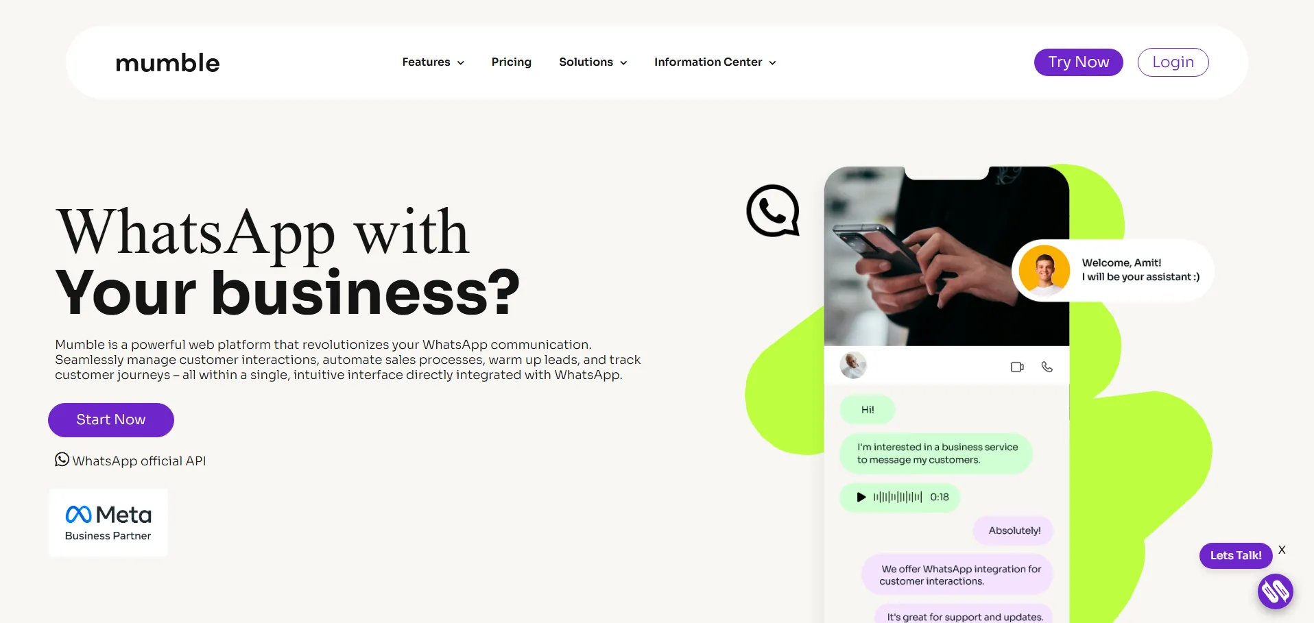 Mumble es una solución de mensajería empresarial basada en la API oficial de WhatsApp, diseñada para optimizar la comunicación con clientes. Permite gestionar listas de contactos, lanzar promociones y automatizar ventas a través de chatbots avanzados y asistentes virtuales con análisis inteligentes. Con su interfaz intuitiva, centraliza la gestión de leads y clientes, ofrece atención 24/7 y automatiza los flujos de comunicación para mejorar la conversión y la eficiencia operativa.