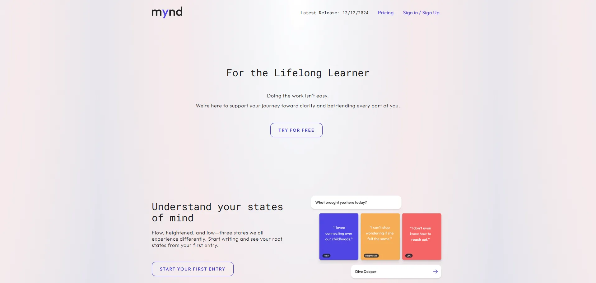 Mynd es una aplicación de diario personal potenciada con IA, diseñada para fomentar la claridad mental y el crecimiento personal. Con Mynd, puedes capturar inspiraciones diarias, reflexiones y desafíos en un entorno seguro y privado. Su motor de reconocimiento de patrones identifica tendencias emocionales a lo largo del tiempo y ofrece preguntas personalizadas para profundizar en tu auto-reflexión. Ideal para quienes buscan mejorar su bienestar emocional, Mynd prioriza la confidencialidad de tus datos con cifrado de extremo a extremo.