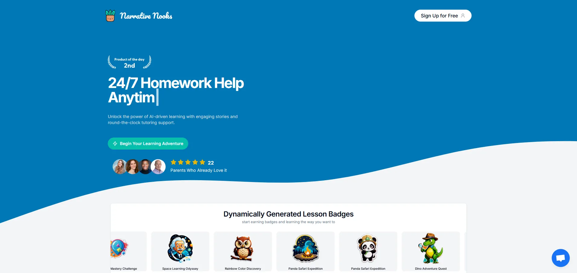 Narrative Nooks es una plataforma de aprendizaje basada en inteligencia artificial que transforma la educación infantil mediante historias interactivas. Ofrece lecciones diseñadas para captar la atención de los estudiantes y reforzar conceptos en materias como ciencias, matemáticas y lectura. Con tutorías disponibles las 24 horas, permite a padres y educadores brindar apoyo inmediato, mientras que sus herramientas de creación de contenidos—historias personalizadas, audios e imágenes generadas a demanda e insignias dinámicas—mejoran la motivación y el seguimiento del progreso.