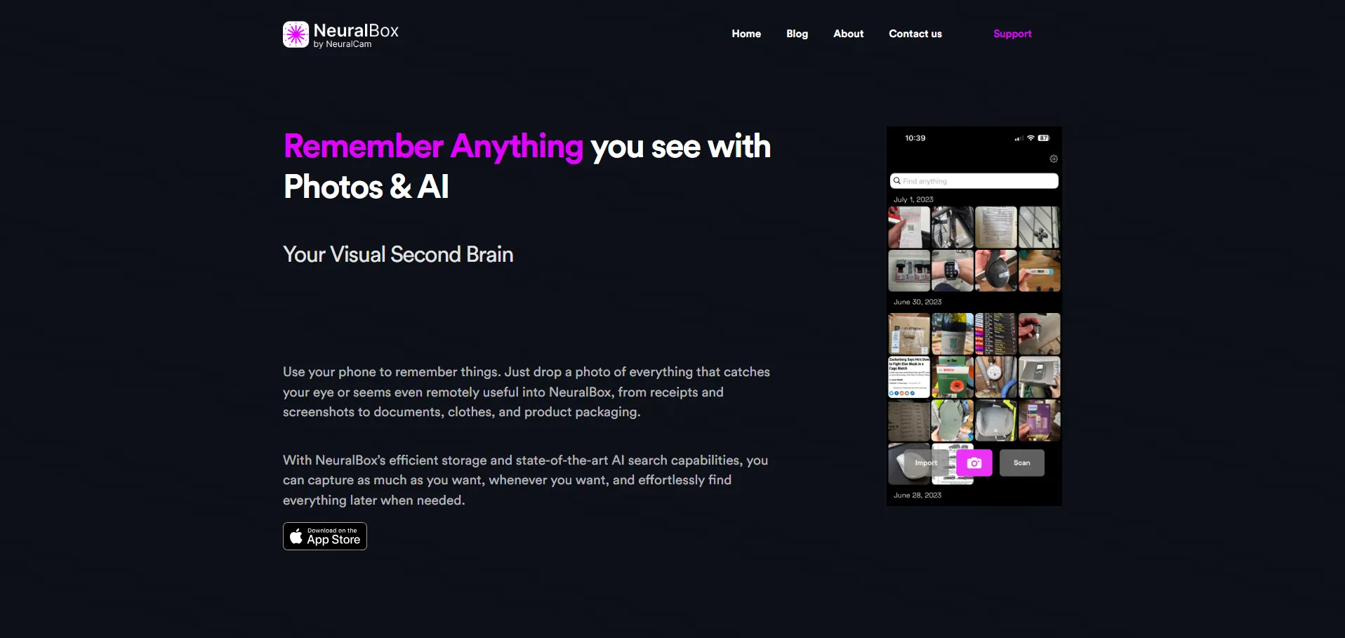 NeuralBox es una herramienta impulsada por inteligencia artificial que actúa como tu segundo cerebro visual, facilitando la captura, el almacenamiento y la búsqueda de cualquier imagen o documento. Su avanzada tecnología de OCR e IA indexa automáticamente fotos de recibos, documentos, productos y más, sin necesidad de carpetas ni etiquetas, para que encuentres lo que buscas con una simple búsqueda por palabra clave o descripción.