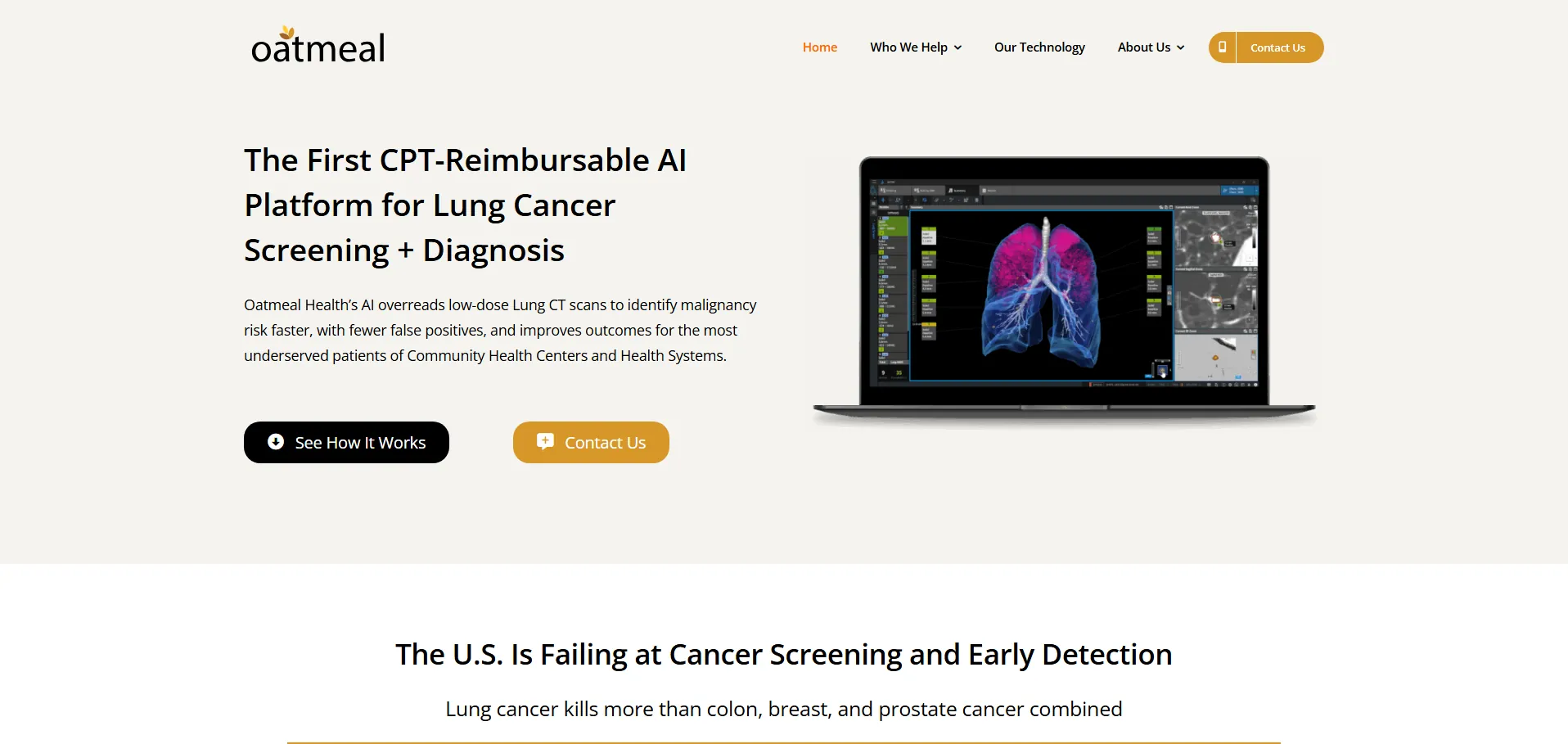 Oatmeal Health es una plataforma de detección de cáncer impulsada por inteligencia artificial, diseñada para mejorar la detección temprana y promover la equidad en salud. Mediante análisis de datos y aprendizaje automático, identifica pacientes de alto riesgo de cáncer de pulmón y de mama, ofrece evaluaciones de riesgo personalizadas y guía integral de atención. Colabora con proveedores de salud y planes médicos para programar pruebas de imagen, educar a los pacientes y reducir costos sanitarios, con especial foco en comunidades marginadas.