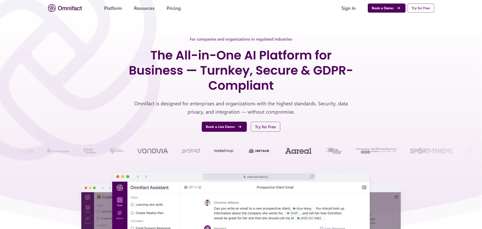 Omnifact es una plataforma de IA generativa empresarial que prioriza la soberanía y la seguridad de los datos en entornos corporativos. Su solución principal, Omnifact Chat, funciona como alternativa segura a los modelos de chat convencionales, incorporando enmascaramiento avanzado de datos y filtrado de contenido totalmente personalizable. Cumple con el RGPD y se ofrece tanto en la nube como en instalaciones locales, lo que facilita una integración fluida con grandes proveedores de modelos de lenguaje sin comprometer la privacidad ni el control de la información confidencial.