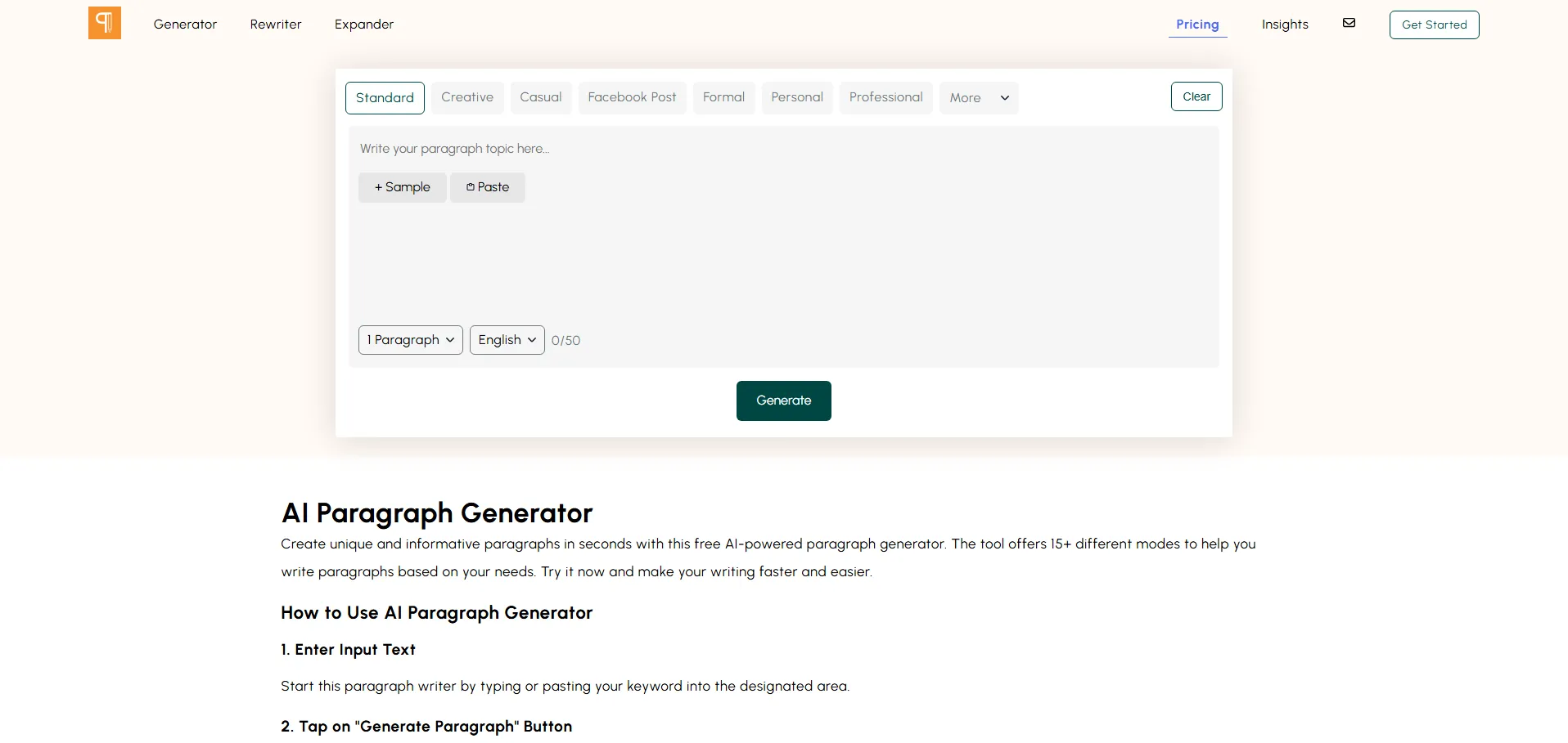 📌 Plan gratuito: generación ilimitada de párrafos básicos, modos de estilo fundamentales, detector de plagio y optimización SEO.