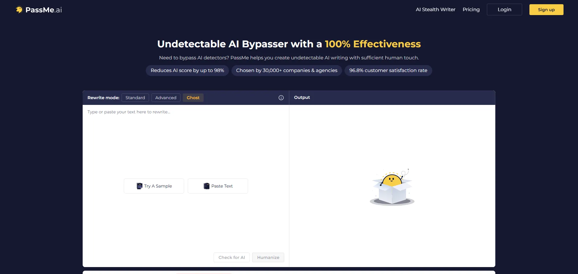 PassMe AI es una solución de escritura con IA orientada a generar contenido con apariencia 100 % humana y evadir los sistemas de detección más habituales, como Turnitin o GPTZero. Gracias a modelos de lenguaje de última generación y a un modo de reescritura ajustable, elimina patrones de IA detectables y ofrece textos originales y auténticos en más de 50 idiomas. Ideal para quienes buscan mantener la integridad académica, profesional y de marketing sin sacrificar calidad.