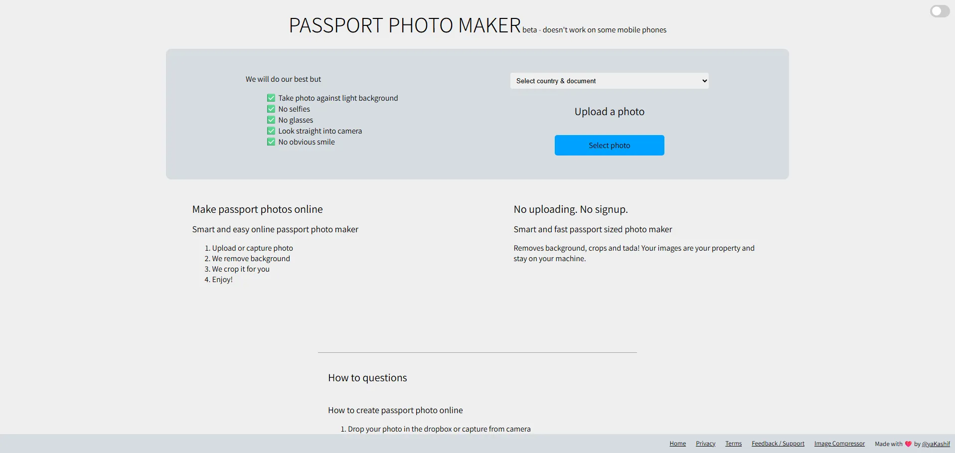 Passport Photo Maker es una herramienta beta diseñada para capturar fotos de pasaporte que cumplen con los requisitos específicos de cada país. Ofrece fondos claros, soporte para selfies con gafas y mirada frontal, y una interfaz intuitiva para seleccionar el país y tipo de documento. Admite pasaportes, visados y carnés de identidad de más de 100 países, permitiendo obtener fotos de calidad profesional sin salir de casa.