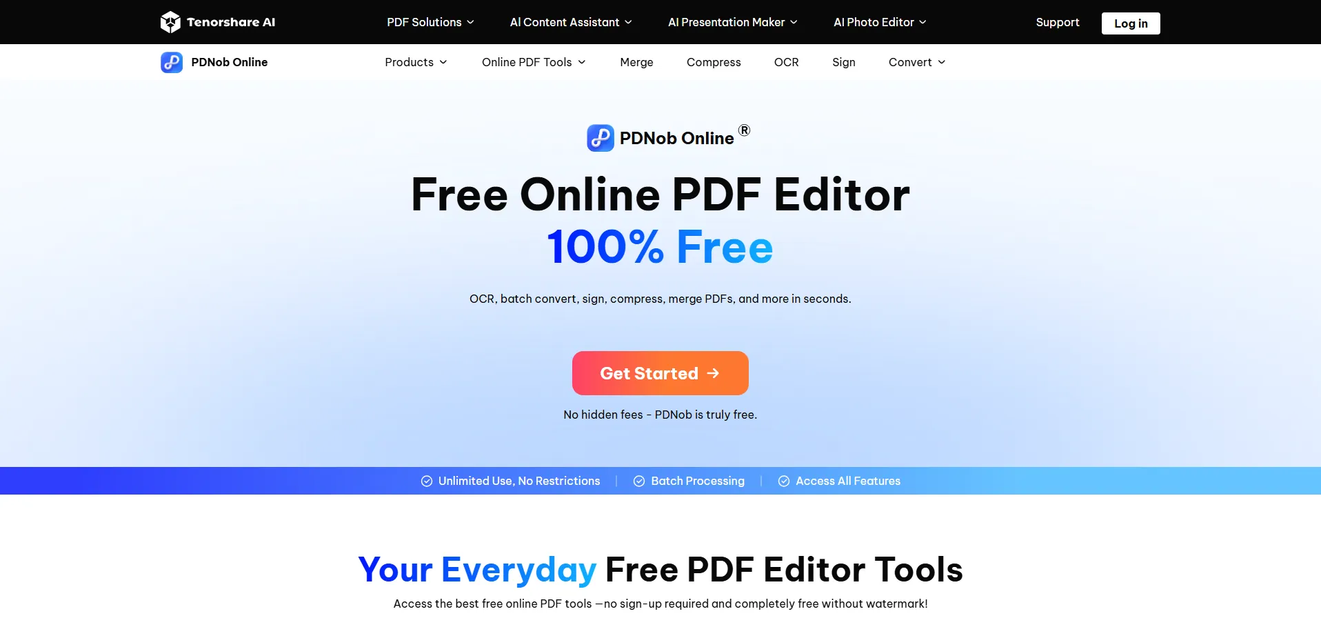 PDNob Online es una potente herramienta de PDF en línea completamente gratuita diseñada para optimizar tu flujo de trabajo con archivos PDF. Incorpora la avanzada tecnología de OCR de ABBYY para extraer texto editable de escaneos e imágenes en múltiples idiomas. Además, permite fusionar, comprimir, convertir, firmar y proteger documentos PDF sin necesidad de instalar software. Su procesamiento por lotes facilita el manejo de múltiples archivos y garantiza la seguridad mediante cargas cifradas y almacenamiento temporal. Todo ello sin marcas de agua, anuncios ni registros, manteniendo siempre el diseño y formato originales.