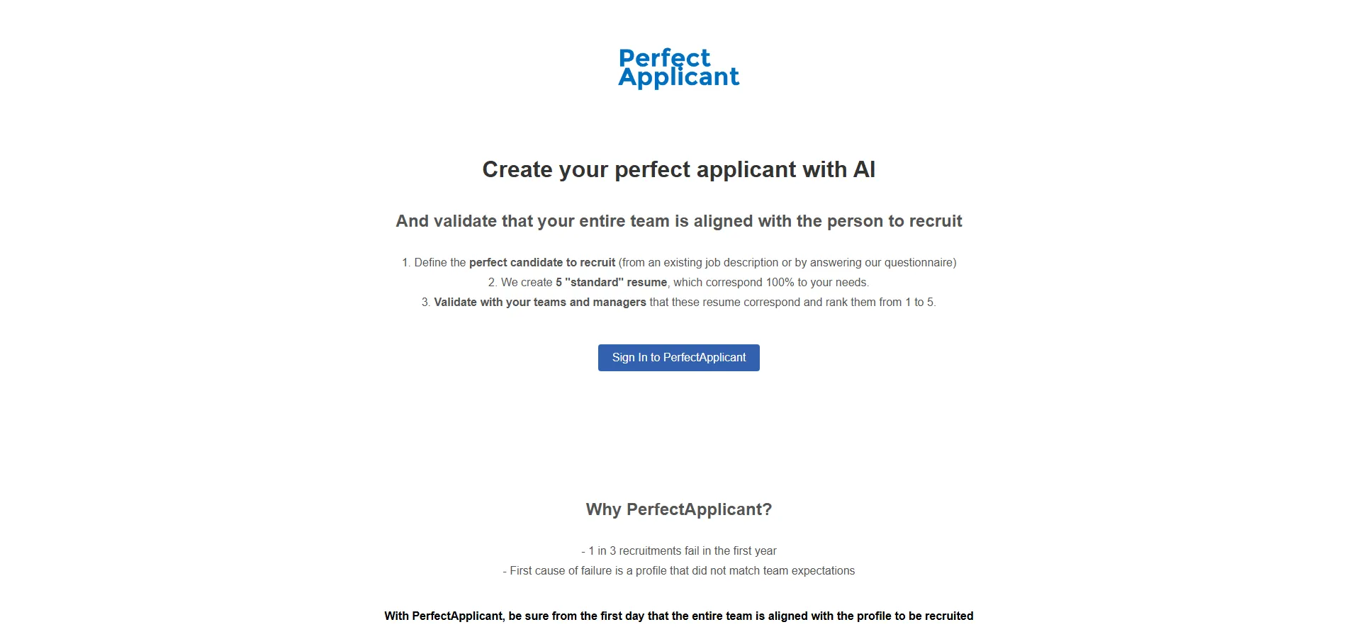 PerfectApplicant es una solución de reclutamiento impulsada por inteligencia artificial que agiliza la selección de talento y garantiza la alineación entre candidatos y equipos. Permite definir al candidato ideal mediante descripciones de puesto y cuestionarios personalizados, genera cinco currículums estandarizados ajustados a los requisitos establecidos y valida las postulaciones de los líderes de equipo para asegurar coherencia desde el primer día.