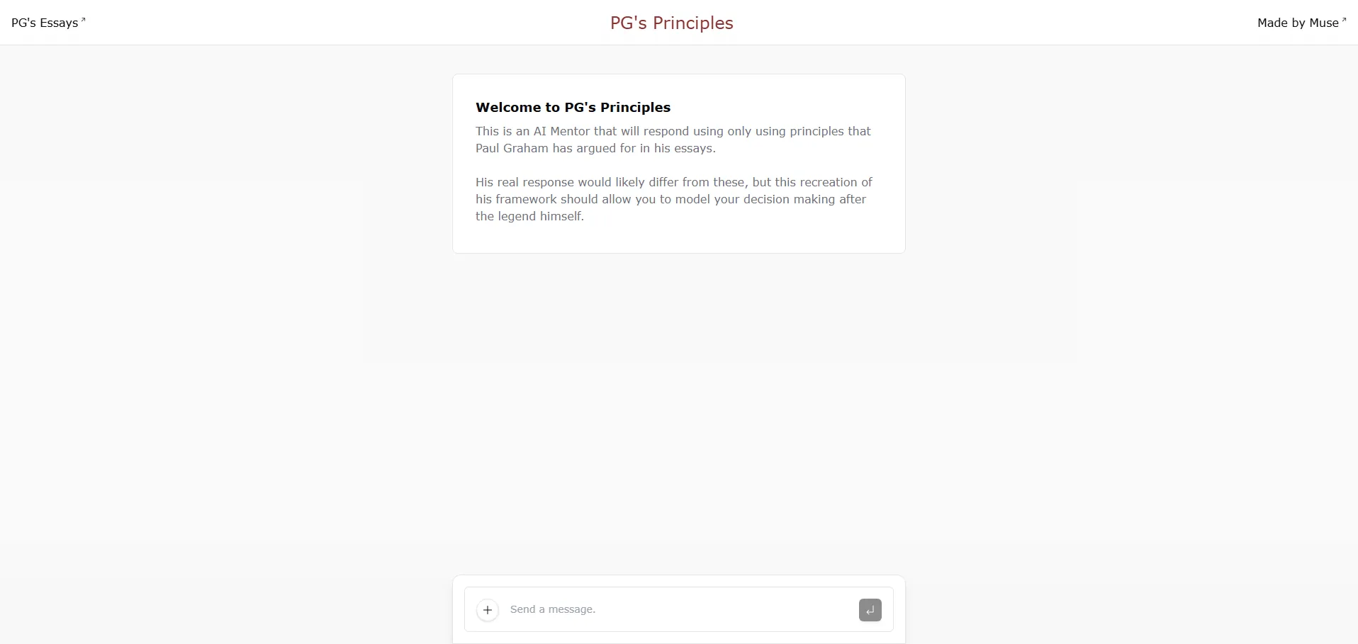Principios PGS es un mentor de inteligencia artificial que incorpora los ensayos y principios de Paul Graham para ofrecer asesoramiento estratégico y de producto. Al procesar tus consultas, la IA genera respuestas personalizadas que reflejan la visión de este emprendedor e inversor, facilitando marcos de trabajo prácticos para la toma de decisiones, el desarrollo de startups y el crecimiento personal.