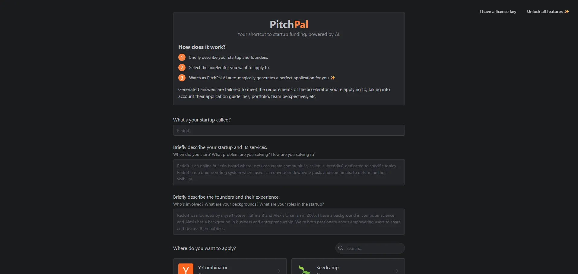 PitchPal es una plataforma de inteligencia artificial diseñada para agilizar y optimizar el proceso de solicitud de financiamiento de startups. Utiliza IA para generar respuestas personalizadas alineadas con los requisitos de aceleradoras como Y Combinator, Seedcamp, Techstars y más, teniendo en cuenta directrices específicas, análisis de portafolio y la trayectoria del equipo.
