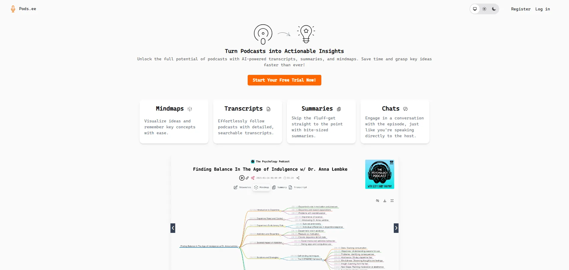 Podsee es una plataforma impulsada por IA que transforma episodios de podcasts en transcripciones precisas, mapas mentales intuitivos, resúmenes claros y esquemas organizados. Diseñada para extraer el conocimiento esencial de cada episodio, facilita la búsqueda de información y mejora la retención de ideas. Con tecnología de reconocimiento de voz avanzada y análisis semántico, Podsee convierte el audio en contenido accesible, visual y conciso para oyentes, estudiantes y profesionales.