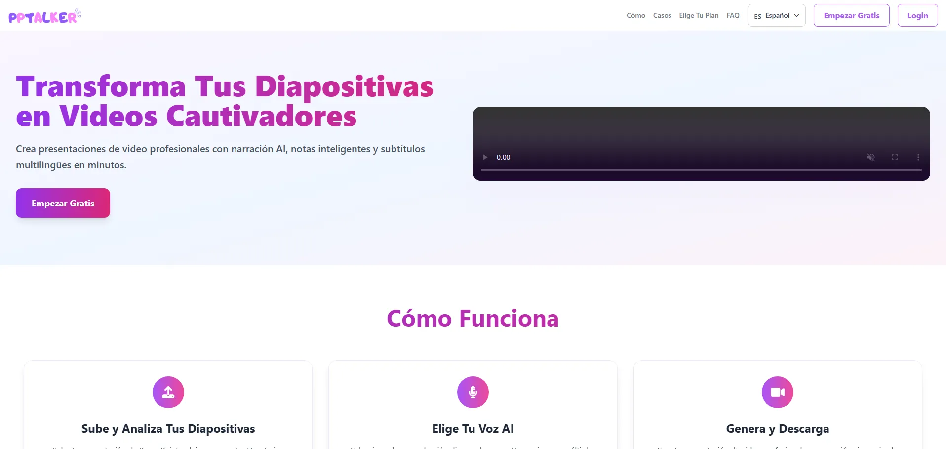 PPTalker es una plataforma en línea que convierte presentaciones de PowerPoint en videos dinámicos y profesionales. Permite transformar archivos PPT o PPTX en formato MP4 integrando voces en off generadas por inteligencia artificial y notas del orador. Su interfaz intuitiva facilita la carga de diapositivas, ofreciendo resultados rápidos y de alta calidad, ideales para conferencias educativas, presentaciones corporativas y materiales de capacitación.