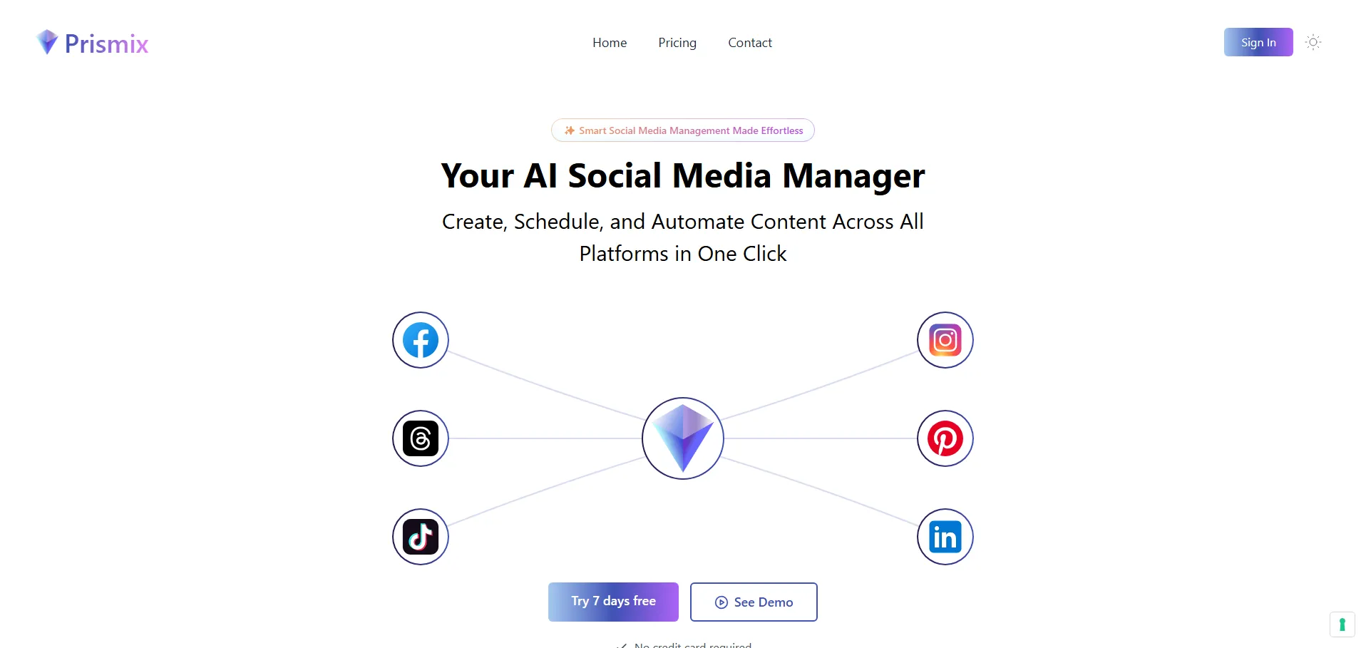 Prismix es una plataforma de gestión de redes sociales potenciada por inteligencia artificial, diseñada para optimizar la creación, programación y automatización de contenido en múltiples canales. Permite generar un calendario de publicaciones de 30 días en segundos, garantizando coherencia de marca y sincronización en el momento de máxima audiencia. Su panel de análisis avanzado ofrece métricas de interacción, crecimiento y rendimiento para tomar decisiones basadas en datos. Además, cuenta con una biblioteca multimedia inteligente para organizar y reutilizar activos visuales, y plantillas personalizables que alinean cada publicación con la voz de la marca.