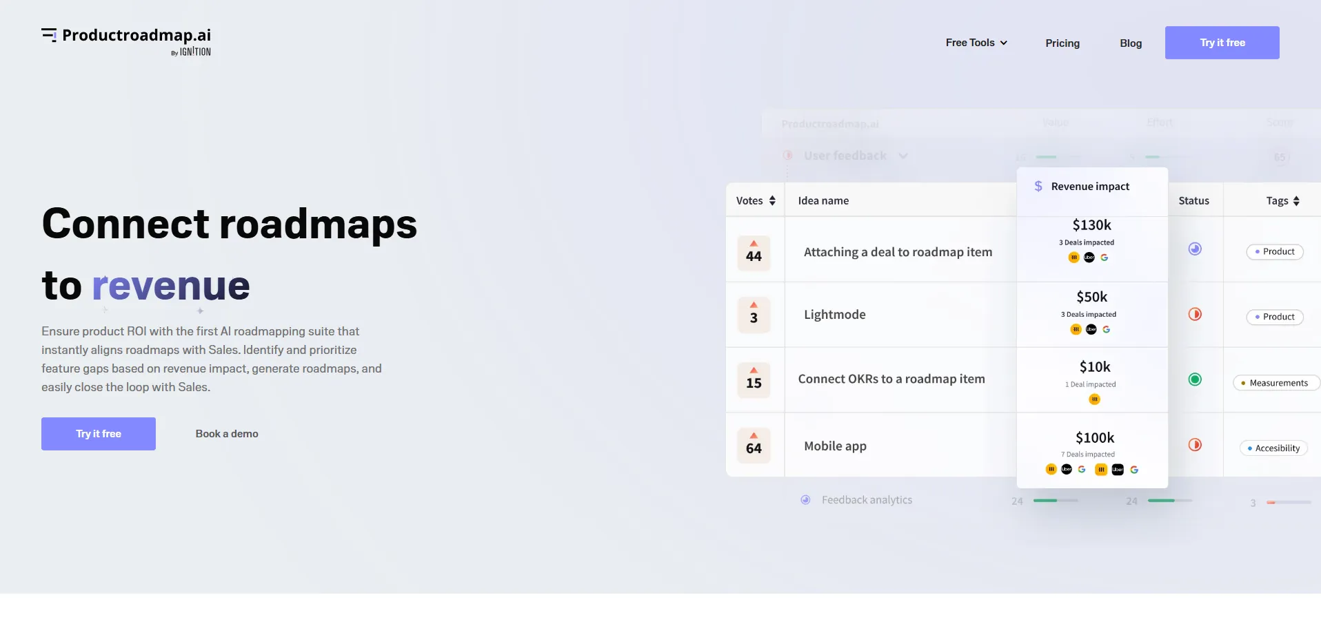 Productroadmap.ai es una solución de hoja de ruta de producto impulsada por inteligencia artificial, creada para optimizar la planificación, el desarrollo y el marketing de nuevas funcionalidades. Analiza automáticamente comentarios reales de clientes obtenidos de transcripciones de llamadas, tickets de soporte y datos de CRM, identificando temas clave e ideas de producto. A cada propuesta le asigna un valor potencial de ingresos y, gracias a sus integraciones con Zoom, Gong, Clari, Salesforce, HubSpot, Intercom y Zendesk, recopila feedback de forma continua. Además, notifica al equipo de ventas cuando el lanzamiento de una función desbloquea oportunidades de negocio.