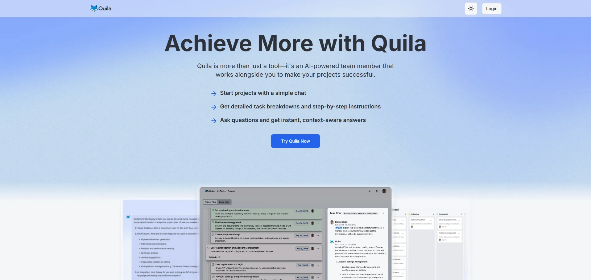 Quila es una plataforma de gestión de proyectos potenciada por inteligencia artificial, creada para mejorar la colaboración en equipo y optimizar la planificación de tareas. Permite iniciar proyectos con simples consultas de chat, generando automáticamente desgloses detallados de actividades e instrucciones paso a paso. Su tablero Kanban intuitivo facilita la visualización de flujos de trabajo, permitiendo arrastrar y soltar tareas, asignar prioridades y supervisar el progreso en tiempo real. Con vistas personalizables en lista o Kanban y asistencia contextual de IA, Quila garantiza que cada miembro del equipo mantenga alineados los objetivos y las entregas.