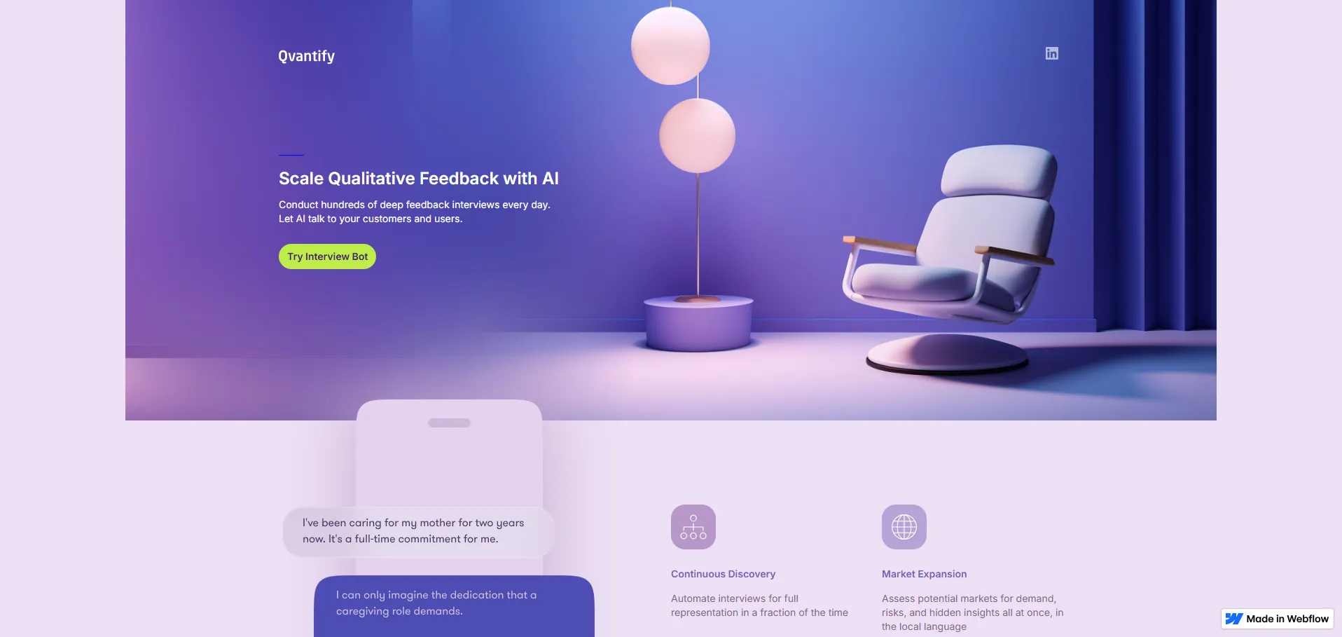 Qvantify es una plataforma de investigación cualitativa potenciada por IA que automatiza cientos de entrevistas remotas en cuestión de horas mediante tecnología GPT. Integra un bot conversacional para descubrir insights de mercado de forma continua, evaluar oportunidades y validar soluciones a través de un enfoque híbrido que combina la rapidez de las encuestas con la profundidad de entrevistas en profundidad. Con opciones de marca blanca y soporte para más de cien idiomas, Qvantify facilita la recolección de datos globales de manera eficiente y escalable.