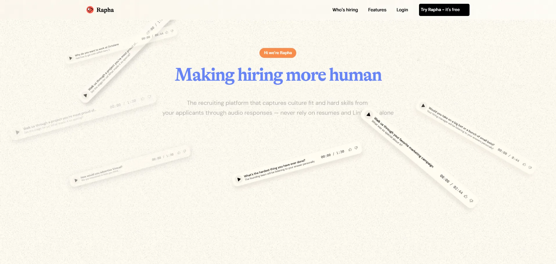 Rapha es una plataforma de reclutamiento humano que agiliza la contratación mediante evaluaciones asíncronas por audio. Sustituyendo currículums y perfiles de LinkedIn, permite medir la adaptación cultural y las habilidades técnicas de los candidatos, ofreciendo un proceso de selección más dinámico. Su panel centralizado y CRM integrado facilitan el seguimiento de etapas, comentarios y evaluaciones en varios idiomas, optimizando la contratación global y la calidad del talento.