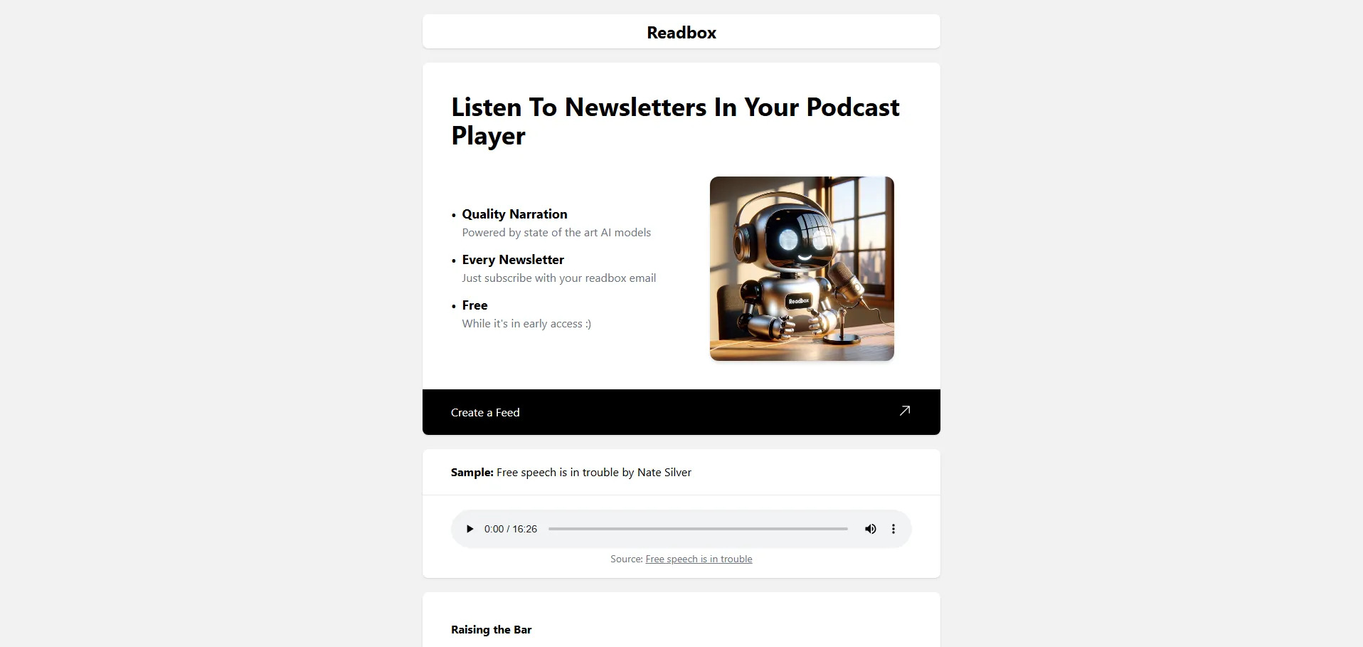 Readbox es una herramienta de inteligencia artificial que convierte cualquier contenido escrito en episodios de audio tipo podcast. Gracias a sus modelos de IA de vanguardia, los usuarios pueden enviar URL o reenviar correos electrónicos a @readbox.app para transformar artículos, blogs o boletines en audios de alta calidad. La plataforma es gratuita para un amplio número de personas y prioriza la privacidad del usuario, asegurando siempre la atribución al creador original sin distribución pública.
