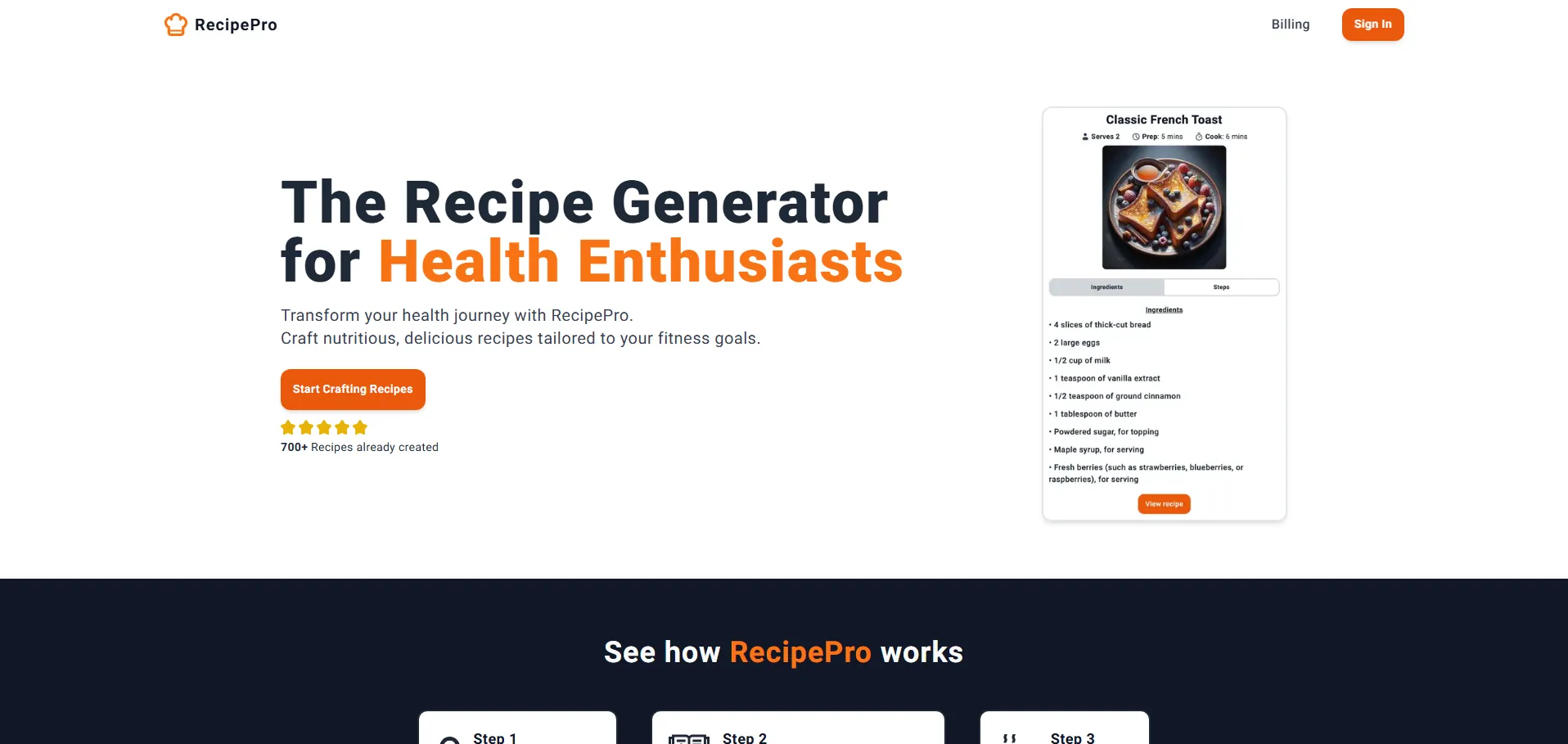 Recipe Pro es un generador de recetas con IA orientado a entusiastas de la salud y el bienestar. Permite crear recetas nutritivas y deliciosas, alineadas con tus objetivos de fitness, gracias a su base de datos de más de 700 recetas preexistentes. Esta herramienta personaliza cada plato según tus preferencias y restricciones dietéticas, ofreciendo desgloses nutricionales completos, sustituciones de ingredientes para opciones más saludables y listas de compra simples con productos fáciles de encontrar. Con instrucciones de cocina claras y paso a paso, Recipe Pro se adapta a todos los niveles, brindando una experiencia culinaria a medida.